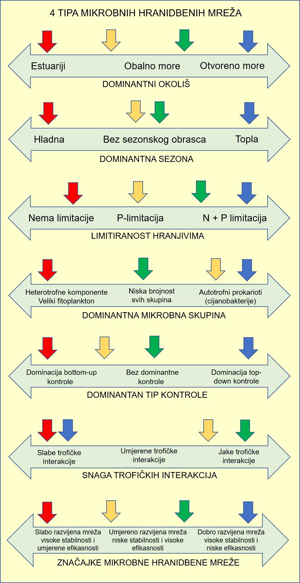 Svaki od ova 4 tipa mikrobnih hranidbenih mreža ima svoje specifične strukturne značajke koje se odražavaju i na njihovu ulogu u morskim ekosustavima. Tip 1 je karakterističan je za topliji dio godine te uvjete siromaštva solima dušika i fosfora. U ovom tipu dominiraju mali autotrofni organizmi (osobito cijanobakterije) koji imaju veliki udio u primarnoj proizvodnji, a koji su dominantno kontrolirani od svojih grabežljivaca (flagelata i cilijata). U mnogočemu Tip 4 je suprotan, naime Tip 4 je karakterističan za estuarijska područja sa sniženim salinitetom te za hladniji dio godine. U njemu dominira veliki fitoplankton, kao i heterotrofna komponenta hranidbene mreže (heterotrofne bakterije i njihovi predatori), koja je dominantno kontrolirana količinom dostupne hrane a ne grabežljivcima. Tip 2 i Tip 3 nisu sezonski određeni i ne pokazuju dominantni tip kontrole (jednako su kontrolirani hranom i grabežljivcima). Međusobno se bitno razlikuju u udjelu i važnosti malih skupina autotrofnog fitoplanktona koji su veći u Tipu 3, kao i po ograničavajućim hranjivima. Budući se Tip 2 razvija u uvjetima siromaštva dušikom i fosforom (po tome je sličan Tipu 1), dok je Tip 3 karakterističan za okoliše ograničene fosforom, ali relativno bogate dušikom.