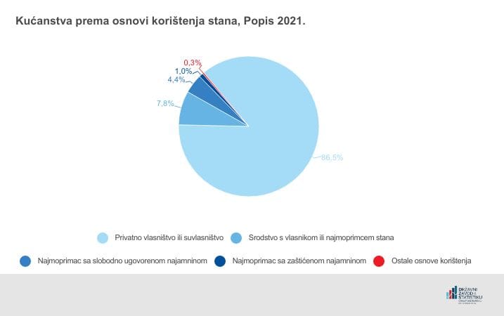 U nastanjenim stanovima u Republici Hrvatskoj živjelo je ukupno 1 433 445 kućanstava, koji su se tim stanovima koristili prema različitim osnovama. Najveći udio, njih čak 86,5%, činila su kućanstva privatnih vlasnika ili suvlasnika, 7,8% kućanstava koristilo se stanom na temelju srodstva s vlasnikom ili najmoprimcem stana, dok se 4,4% kućanstava stanom koristilo na temelju slobodno ugovorene najamnine s vlasnikom stana. Bilo je 1,0% kućanstava sa statusom najmoprimca sa zaštićenom najamninom, a 0,3% kućanstava koristilo se stanom po ostalim osnovama.