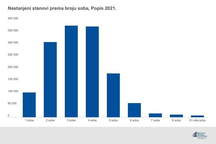 Od ukupno 1 433 445 nastanjenih stanova, najveći broj odnosi se na trosobne stanove (26,3%), četverosobne (26,0%) i dvosobne stanove (21,6%). Peterosobnih stanova ima 12,6%, jednosobnih 7,1%, šesterosobnih 4,1%, dok je udio stanova sa sedam, osam te devet i više soba u rasponu od 0,5% do 1,1%.