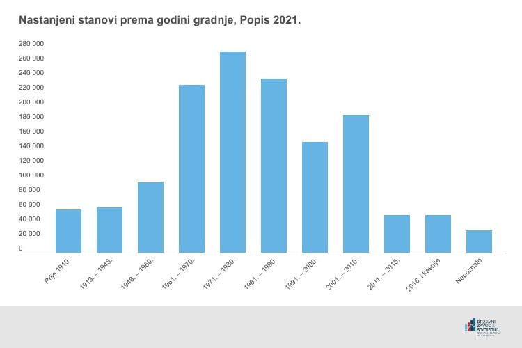 Kad nastanjene stanove promatramo prema godini gradnje, primjećujemo da je najviše stanova, tj. 275 104 stana ili njih 19,2%, izgrađeno u razdoblju 1971. − 1980., njih 237 654 ili 16,6% u razdoblju 1981. − 1990., a u razdoblju 1961. − 1970. ukupno 229 513 stanova ili 16,0%.