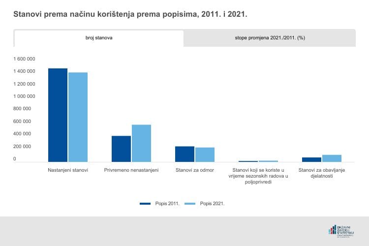 Detaljnije podatke o broju stanova po pojedinim kategorijama te stope promjena u odnosu na Popis 2011. možete pogledati u nastavku.