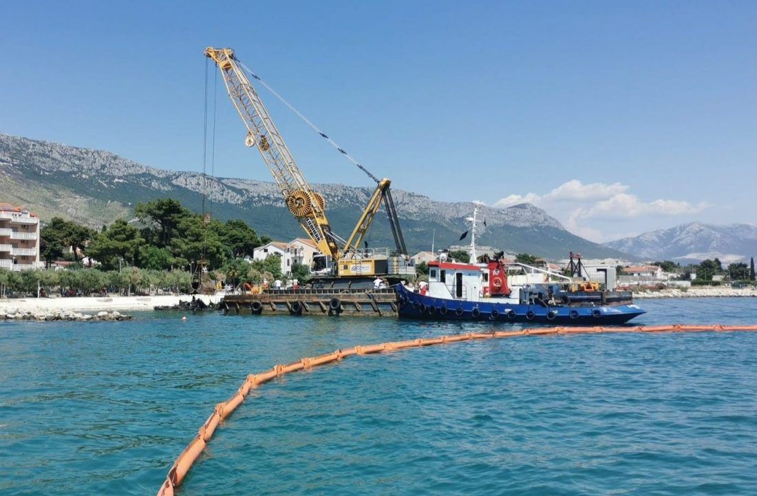 KAŠTEL GOMILICA – U Kaštel Gomilicu uplovljava dizalica kojom će se pokušati ukloniti izgorene brodice koje su nakon velikog požara u Marini Gomilica premještene na jedinu uređenu plažu na ovom području.