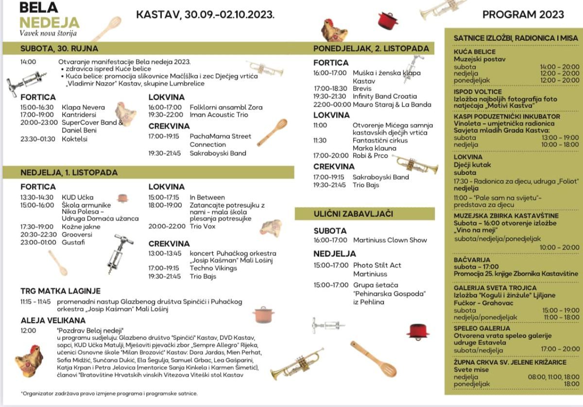 Gradu slijede tri najbolja dana u godini u skopu Bele nedeje, najveće i najpoznatije fešte u čast mladom vinu. Bela nedeja najveći je kastavski blagdan, kastavska užanca, stoljetna tradicija za koju i danas svi mještani i pravi prijatelji Kastva žive cijelu godinu, pišu Turističke priče.