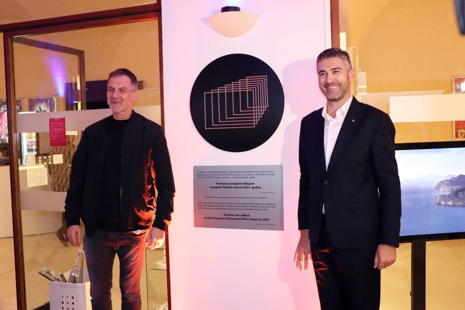 DUBROVNIK - Stradun je i službeno proglašen dijelom Blaga europske filmske kulture. Tim je povodom u Luži u četvrtak održana prigodna svečanost kojoj su nazočili gradonačelnik Grada Dubrovnika Mato Franković, zamjenica gradonačelnika Jelka Tepšić, ravnatelj ustanove u kulturi Kinematografi Dubrovnik Nikša Konsuo te član Europske filmske akademije, ugledni hrvatski filmski producent Boris T. Matić, koji je i službeno u Dubrovnik donio ploču te je ona postavljena u prostoru Luže.
