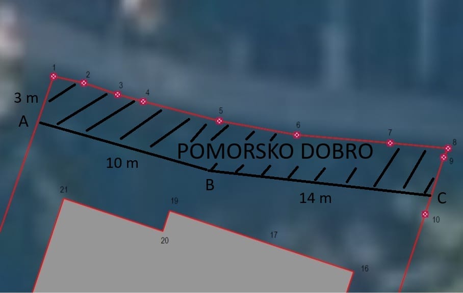 - Očigledno je povrijeđeno materijalno pravo, jer st. 3. čl. 6. Zakona o pomorskom dobru i morskim lukama, glasi: 'Kopneni dio pomorskog dobra je pojas kopna uz more koji je po svojoj prirodi u neposrednoj vezi s morem i prema namjeni i načinu upotrebe služi uobičajenom korištenju i upotrebi mora kao općeg dobra, a širok je najmanje šest metara od crte srednjih viših visokih voda mjereno vodoravno'. Najmanje 72 m² k.č. 247/2 k.o. Dubrovnik Nova je ex lege pomorsko dobro. Dovoljno je pogledati fotografije pripadajuće lokacije i zaključiti da je sporna građevinska dozvola nezakonito obuhvatila pomorsko dobro. Naime od sjeverne granice k.č. 247/2 k.o. Dubrovnik Nova do mora ima maksimalno 3 m, a vidi se to uostalom i golim okom.