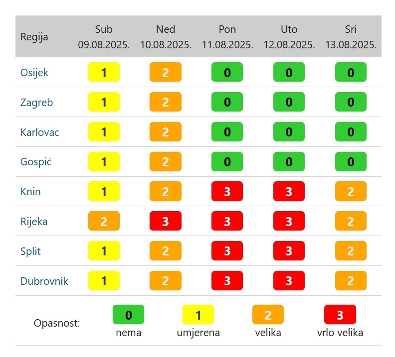 Za sutra je zbog velikih vrućina na snazi upozorenje za cijelu zemlju. Za riječko područje na snazi je crveno upozorenje, a za ostatak zemlje narančasto. U ponedjeljak i utorak crveno upozorenje prošireno je na cijelu obalu.