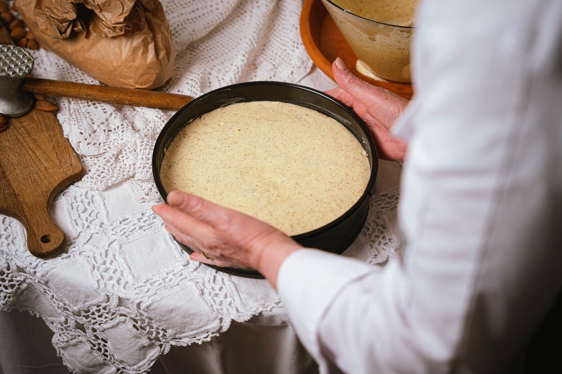 Odvojite žumanjke od bjelanjaka. U posebnoj posudi izradite snijeg od bjelanjaka, zatim pjenasto istucite žumanjke sa šećerom. U smjesu sa žumanjcima naizmjenično dodajte fino mljevene bademe i snijeg, na tako da se miješa odozdo prema gore, sporim pokretima, da se dobije smjesa bez grudica. Kalup za tortu premažite maslacem i lagano pospite brašnom, a višak brašna otresite. Stavite u hladnu pećnicu. Pecite na 180 stupnjeva 40 minuta. Ostavite da se ohladi i pospite šećerom u prahu i nasjeckanim bademima.