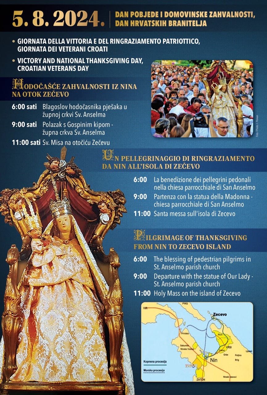 NIN - Na čast Dana domovinske zahvalnosti i Dana pobjede tradicionalno se hodočasti iz Nina na otok Zečevo 5. 8. u ponedjeljak. Organizirano je hodočašće pješačenjem i maritimna procesija s prijenosom čudotvornog kipa Gospe od Zečeva.