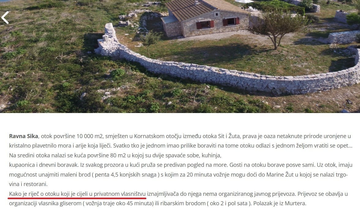 Isto tako piše i na oglasnim platformama, poput airbnb-a, a otok ima i čitavu stranicu na kojoj se jasno i nedvojbeno iznamljuje kao otok koji je, citiramo: "cijeli u privatnom vlasništvu".