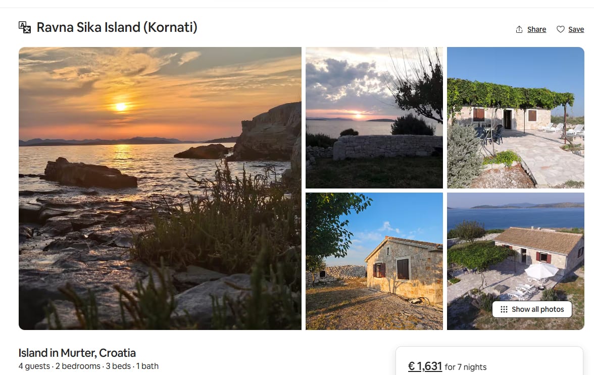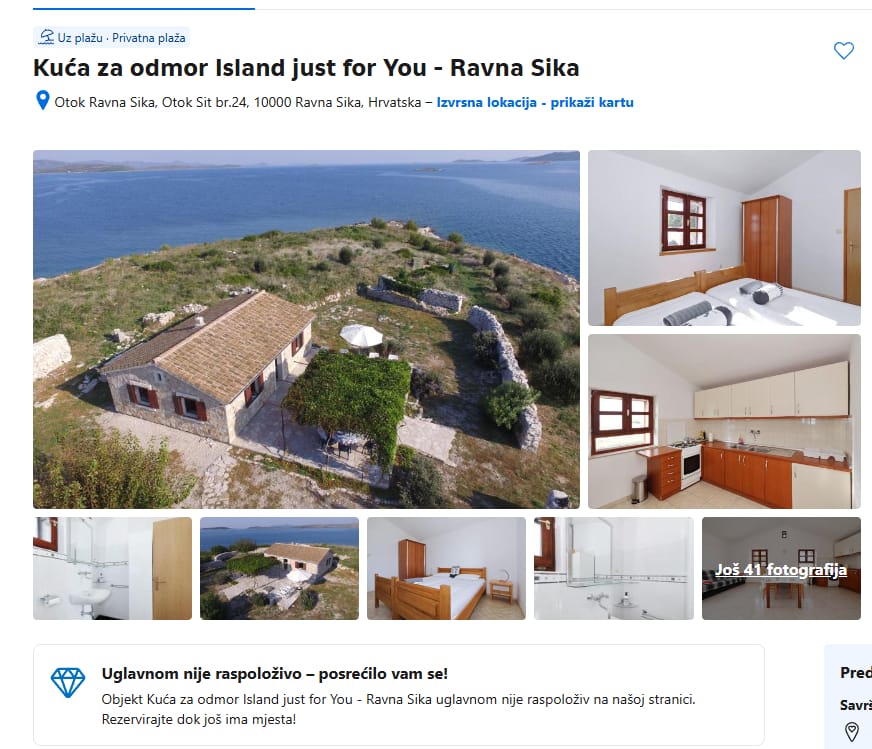 Na nekim drugim platformama, poput Bookinga, oglas je malo drugačije sročen, pa tamo pak stoji da se iznajmljuje "Kuća za odmor Island just for You - Ravna Sika". Znači, kuća za odmor, a odmah to doga stoji i "otok samo za vas". Uz oglas je još dodana i još jedna laž "privatna plaža", što prema hrvatskom zakonodavstvu ne da ne postoji, nego to Zakon o pomorskom dobru i morskim lukama vrlo strogo i nedvojbeno naglašava!
