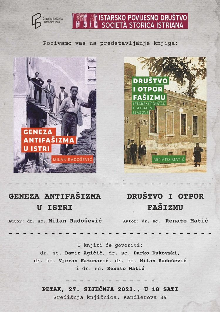 PULA - Istarsko povijesno društvo i Gradska knjižnica i čitaonica Pula organiziraju predstavljanje knjiga Milana Radoševića „Geneza antifašizma u Istri“ i Renata Matića „Društvo i otpor fašizmu. Istarski poučak i globalni izazovi“ koje će se održati u dvorani središnje knjižnice u petak, 27. siječnja 2023., u 18 sati.