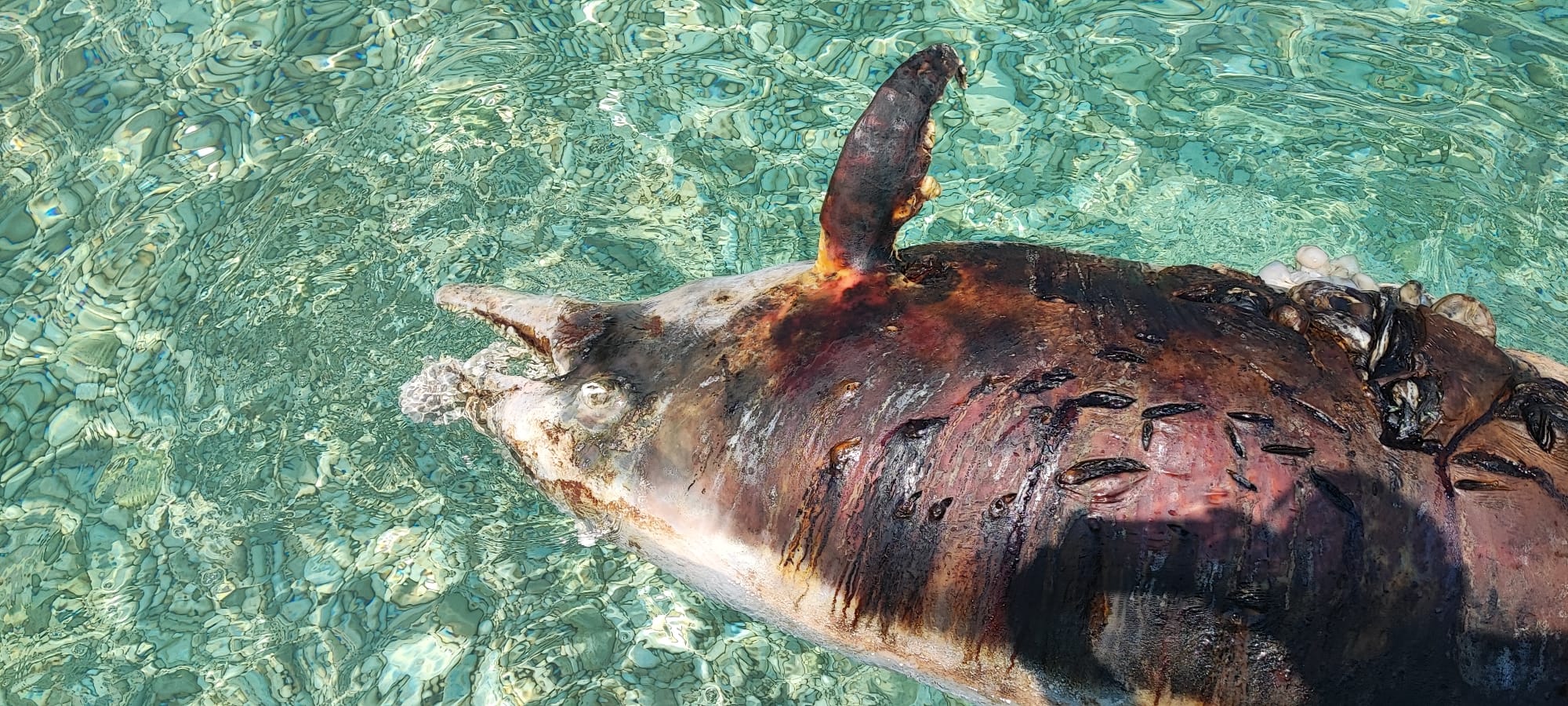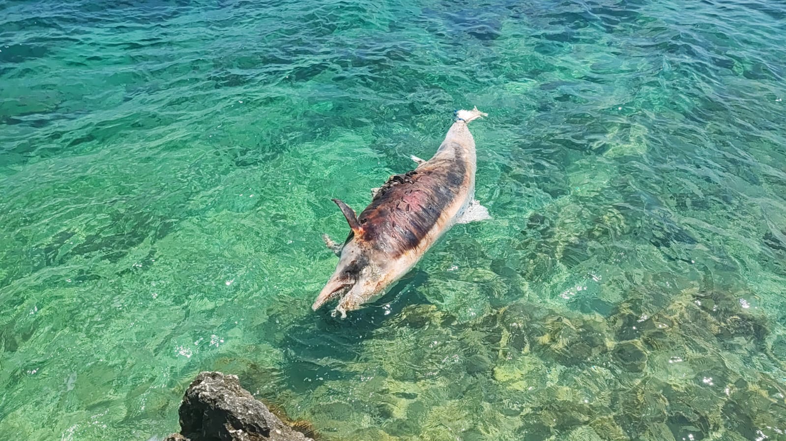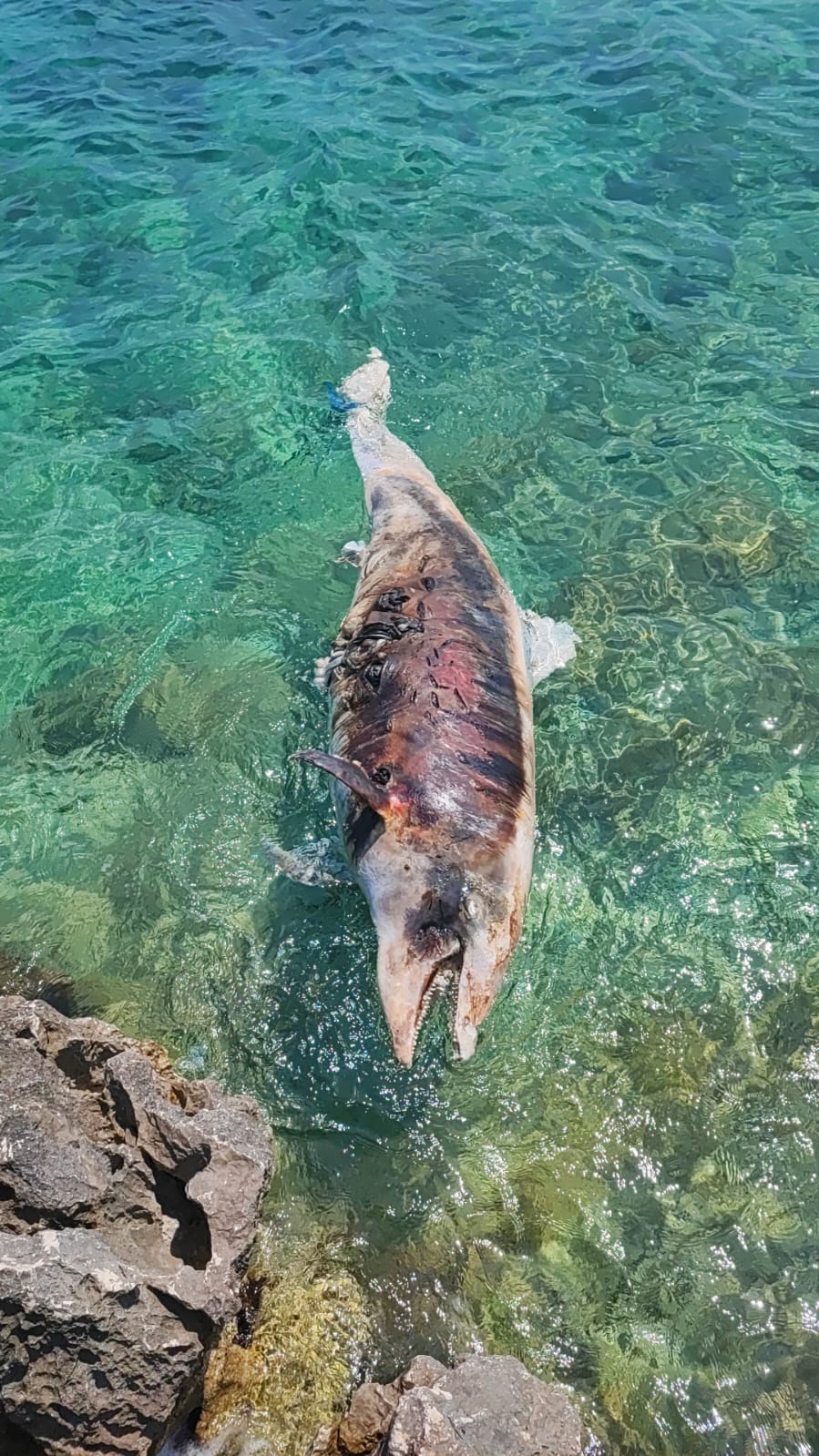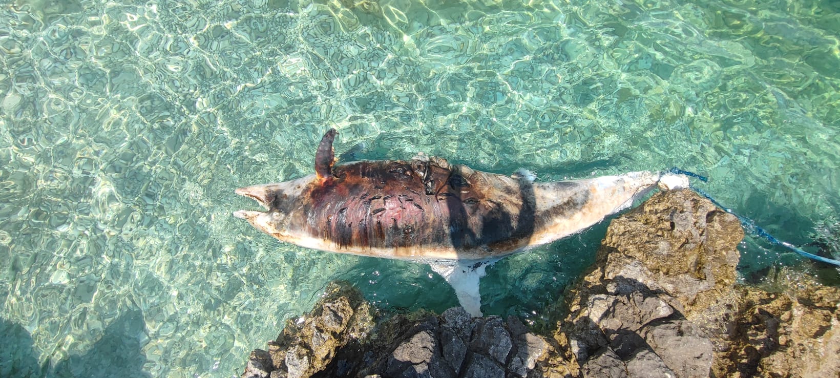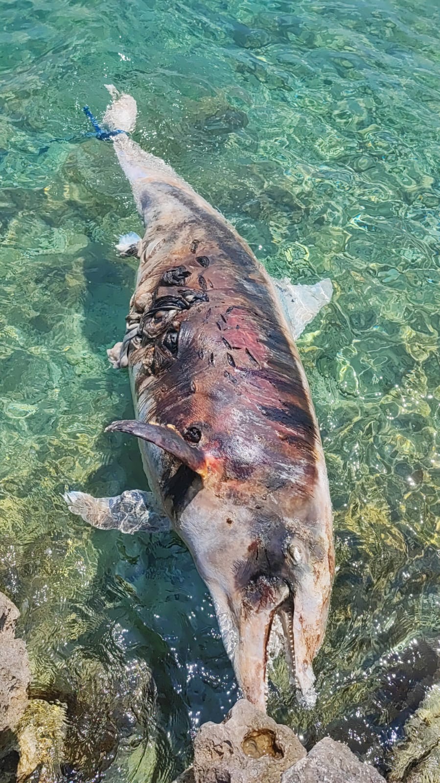 - Na tijelu su mu vidljive posjekotine, moguće od propelera ili oštrih stijena nakon smrti dok je plutao - kazuje nam čitatelj koji nam šalje ove snimke i ukazuje na činjenicu da je životinja pronađena vezana!