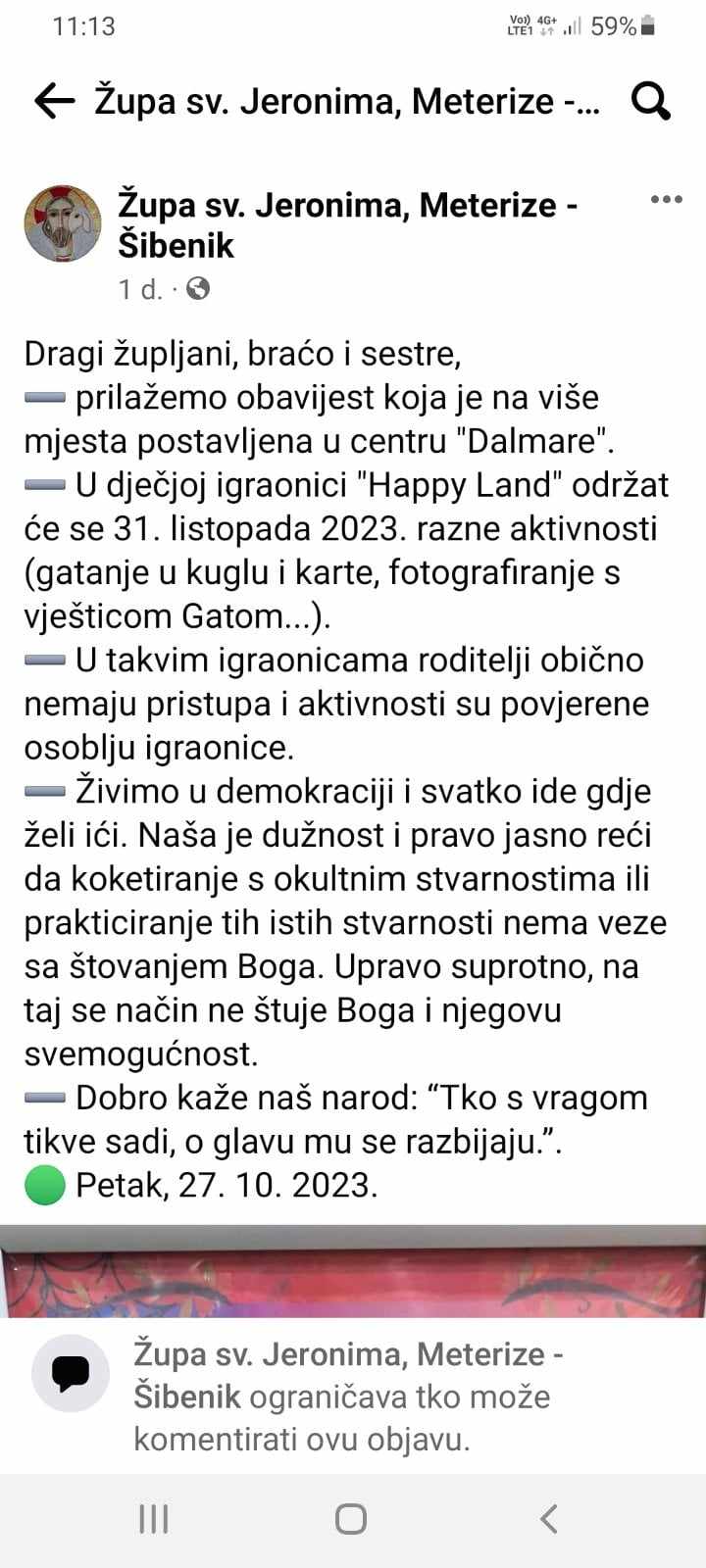 To su najavljeno događanje, beningnu dječju predstavu u kojoj svjetlost i dobro pobjeđuje zlu vješticu inkriminirali u u Župni na Meterizama koji su objavili sljedeće, piše Šibenik News: