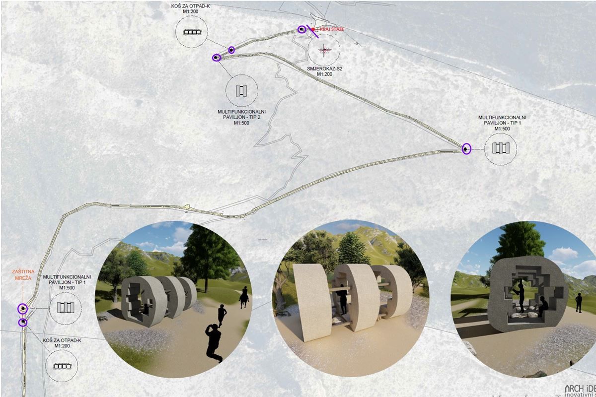 Planirana urbana oprema podrazumijeva izgradnju multifunkcionalnog paviljona od eko prirodnog materijala, a samo pošumljavanje staze će pridonijeti ojačavanju bioraznolikosti na navedenom području.