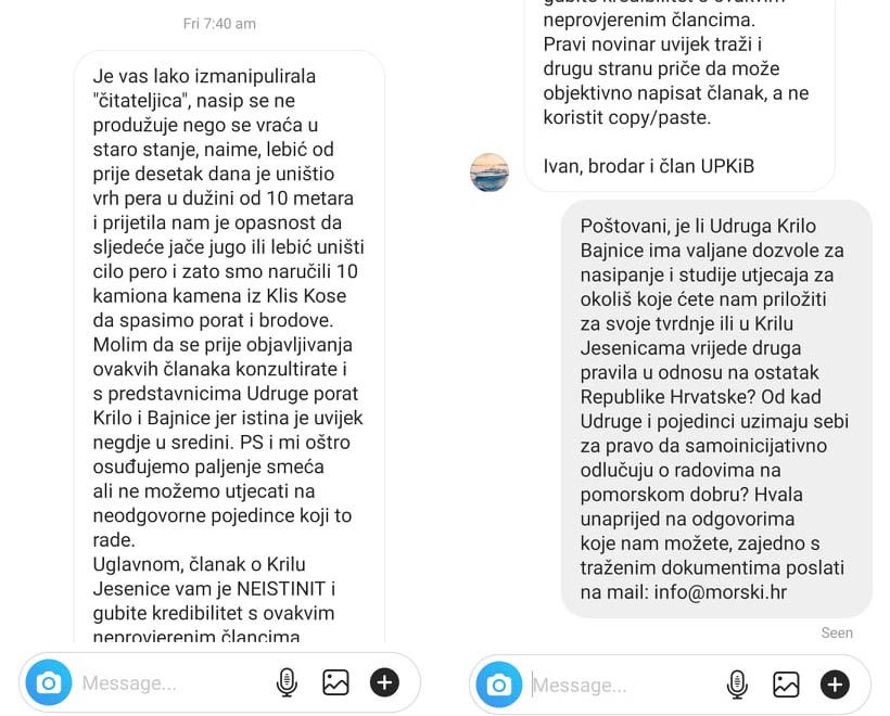 Potrudili smo se potom biti i pravi novinari, pa smo poslali na istu adresu pitanja. Zanimalo nas je, ima li Udruga Krilo Bajnice valjane dozvole za nasipanje i studije utjecaja za okoliš koje će nam priložiti za svoje tvrdnje ili u Krilu Jesenicama vrijede druga pravila u odnosu na ostatak Republike Hrvatske i od kad Udruge i pojedinci uzimaju sebi za pravo da samoinicijativno odlučuju o radovima na pomorskom dobru?