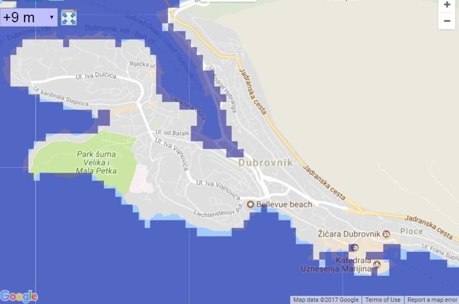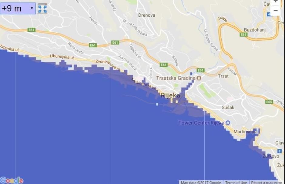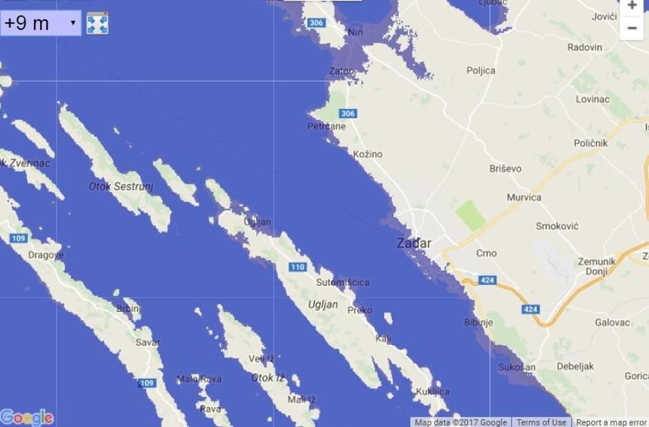 Samo pet godina otkako se u službenim predviđanjima čak i rast mora od 1,5 metara smatralo ekstremnim prognozama, odjednom ispada da su i umjerena predviđanja nekoliko puta gora od toga. Što se Hrvatske tiče, na sljedećim ilustracijama pogledajte će se dogoditi s jadranskom obalom u slučaju rasta mora od 9 metara, što je u skladu s izvještajem PNAS-a.