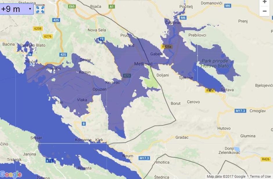 Ovo je u Hrvatskoj na klimatske promjene najranjivije područje. U slučaju već i 4 metra, nestaju Opuzen, Metković i Ploče, Čapljina dobiva svoju rivijeru. No, more se tu ne zaustavlja i potopljena biva i Čapljina, more zapravo prodire do pola puta do Mostara, poljoprivreda je odavno nemoguća. Stradali su i Ston, najnaseljeniji dijelovi svih hrvatskih otoka.