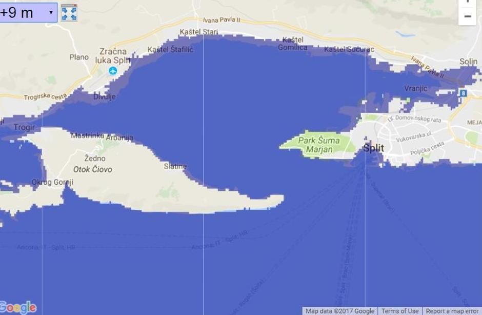 Već i uz rast razine mora od samo jedan ili dva metra, sve rive na Jadranu su poplavljene. U slučaju rasta od 4 metra, po Jadranu je poplavljena i skoro svaka stara gradska jezgra. A u slučaju 9 metara… Trogir je odavno atrakcija još samo za ronioce, kao i pola Solina, Kaštela, Poljuda u Splitu, Dioklecijanove palače, Lore, luke, kolodvora. Južnije, more je prodrlo desecima kilometara u Cetinu, ne postoji više ni Omiš, ni pola Makarske.