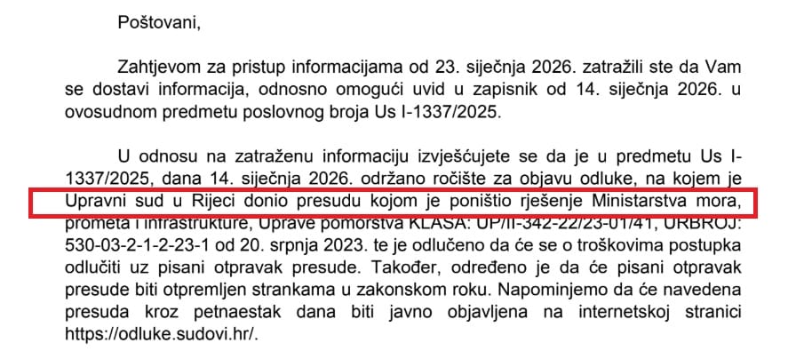 Očekivalo se jedno, ali se dogodilo potpuno suprotno. Dogodilo se da je Upravni sud u Rijeci poništio rješenje Ministarstva mora prometa i infrastrukture, Uprave pomorstva KLASA: UP/II-342-22/23-01/41, URBROJ: