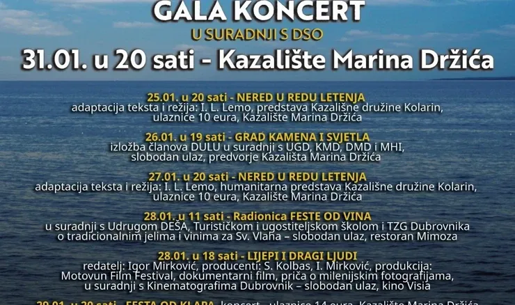 Gala-koncert KOME BI ŠUMILO MORE MOJE SINJE za srebrni jubilej Feste posvećen je najboljem dubrovačkom pjevaču 20. stoljeća Milu Hrniću, kojemu su tu titulu svojim glasovima, na razmeđi milenija, dodijelili slušatelji Radio Dubrovnika i čitatelji Dubrovačkog vjesnika i Slobodne Dalmacije. Za ovaj koncert odabrane su neke od njegovih najpoznatijih pjesama u aranžmanima Ante Gela koje će odsvirati njegovi dugogodišnji suradnici uz gudače DSO-a, a interpretirati pjevači s hrvatskog juga: Klape Kaše, Subrenum, Ragusa Vecchia, Ilko & Nasko, Nevio Končić, Lucas, Sebastijan Vukosavić, Doris Kosović, Maja Grgić & Teo Martinović u subotu, 31. siječnja u Kazalištu Marina Držića. Ulaznice su u prodaji u Kazalištu Marina Držića i online putem servisa www.ulaznice.hr.