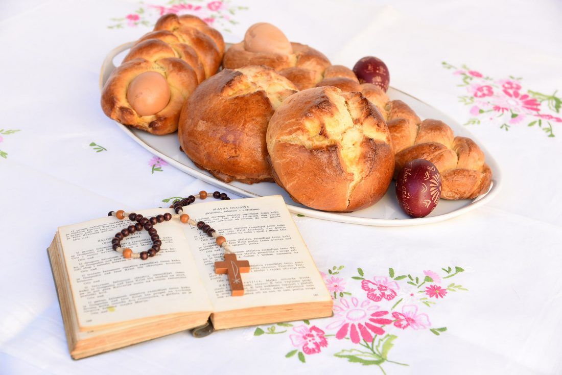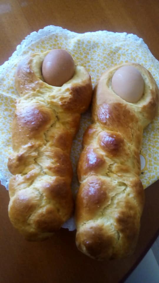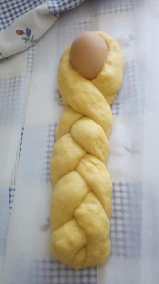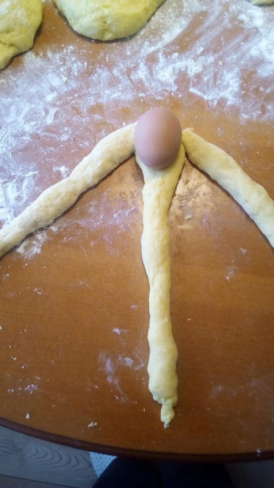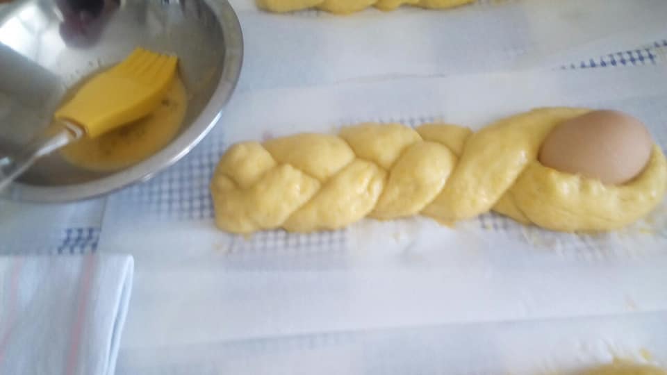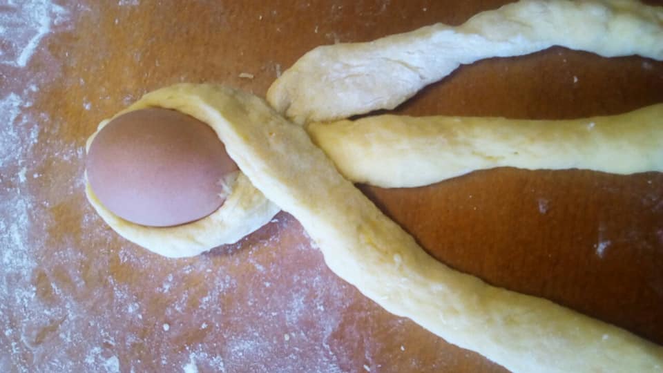 Tijesto zatim oko jaja na jednom kraju oblikovati u pletenice i pustiti da još kisa. Premazati ih jajem i peći na laganoj temperaturi oko 40 minuta.