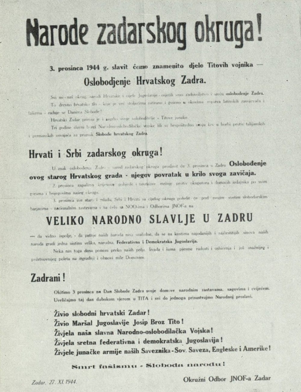 Od posebnog je značenja bilo oslobođenje Zadra, koji se od 1918. do kapitulacije fašističke Italije 8. rujna 1943. nalazio pod talijanskom okupacijom i upravom , a od rujna 1943. – 31. listopada 1944. držale su okupaciju Zadra njemačke postrojbe uz pomoć i potporu Mussolinijevih fašista . Zadar je vraćen matici Hrvatskoj. Do kraja rata u Zadru je bilo sjedište GLAVNOG ŠTABA HRVATSKE i drugog političkog rukovodstva federalne Hrvatske.