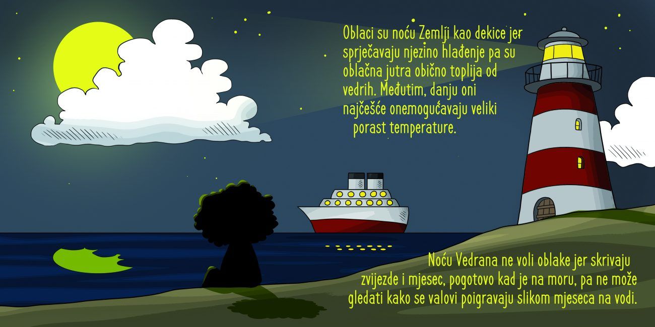 Vedrana pomaže pronalaženju pitanja kao što su: „Što su oblaci? Kako i gdje nastaju? Koliko ih ima i kakvih oblika? Koji su najniži oblaci, a koji najviši? Što i kako proizvode? Može li ih se dodirivati? Kada ih i kako fotografirati?“ i još mnoga druga.