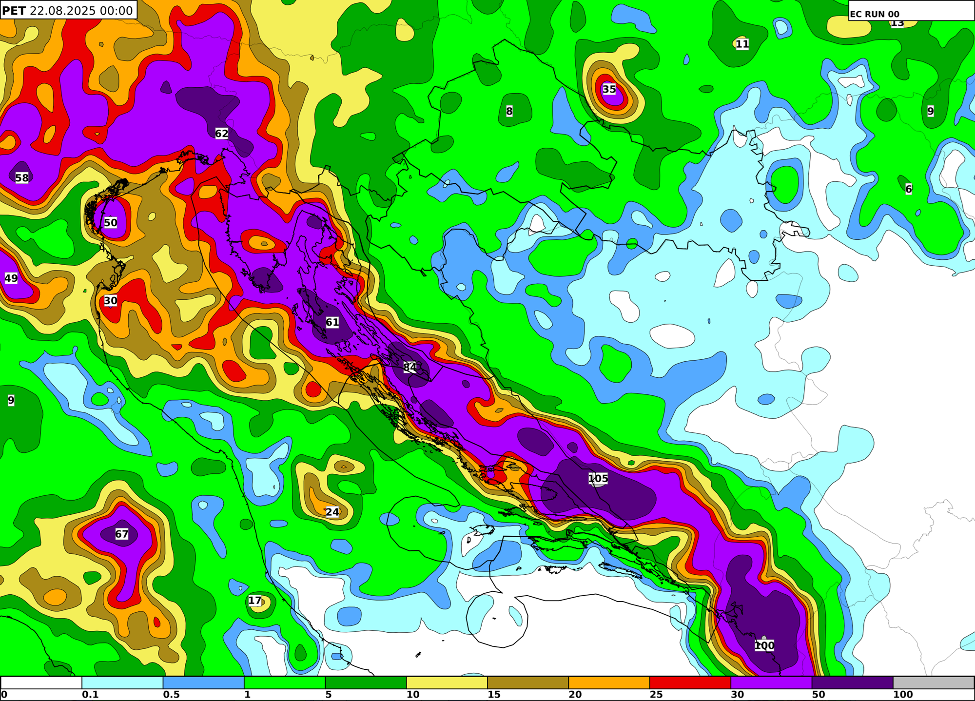 Ukupna 24-satna količina oborine (mm) za razdoblje od 21. kolovoza 2025. u 2 h po lokalnom vremenu do 22. kolovoza 2025. u 2 h po lokalno vremenu. Izvor: ECMWF