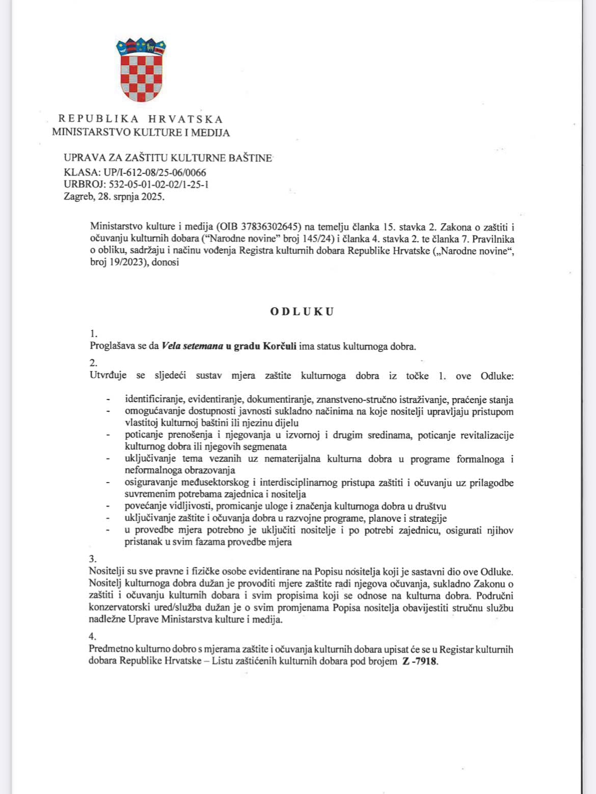 KORČULA - Jedan od najupečatljivijih i najautentičnijih uskrsnih običaja na području Hrvatske, korčulanska Vela setemana, službeno je proglašena nematerijalnim kulturnim dobrom Republike Hrvatske. Ova vijest dolazi kao priznanje bogatoj višestoljetnoj tradiciji i posebnoj duhovnoj atmosferi koja svake godine privlači i okuplja brojne mještane, njihove potomke iz cijeloga svijeta, ali i posjetitelje željne jedinstvenog kulturnog doživljaja.
