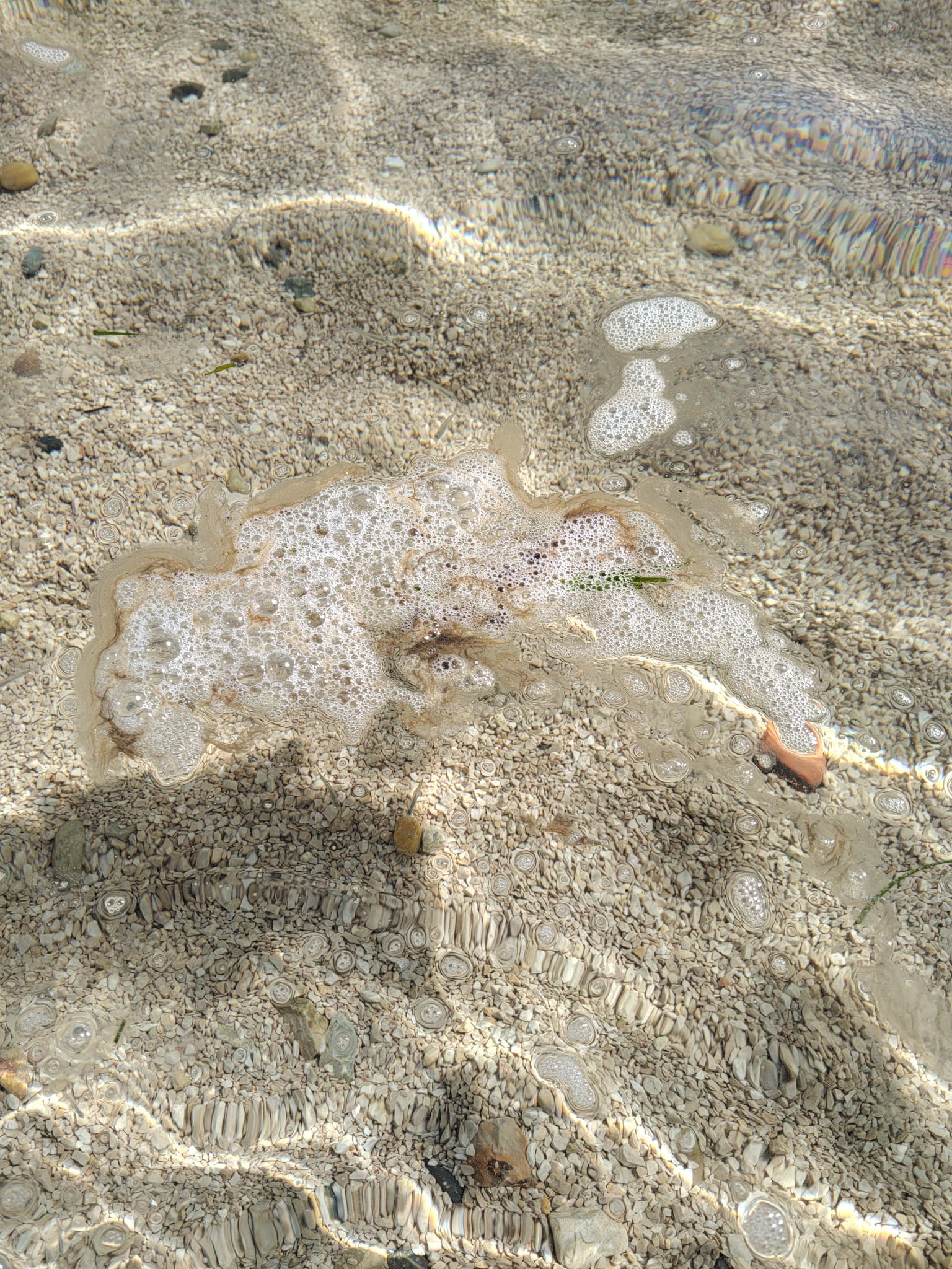 DRAGE/PIROVAC/SRIMA - Na području između Zadra i Šibenika građani danas na više mjesta uz obalu prijavljuju neobičnu pojavu sapunice koja naplavljuje obalni pojas.