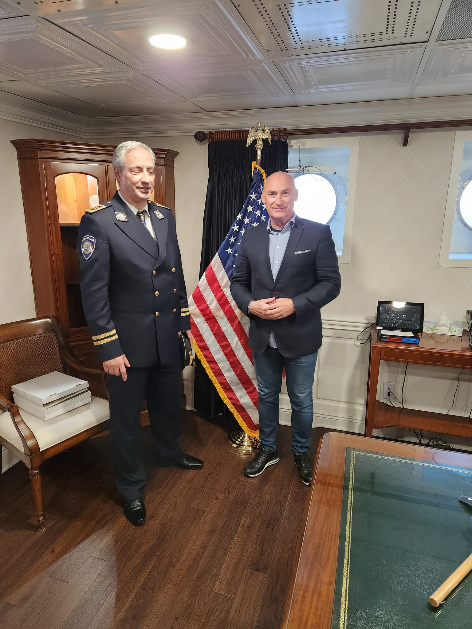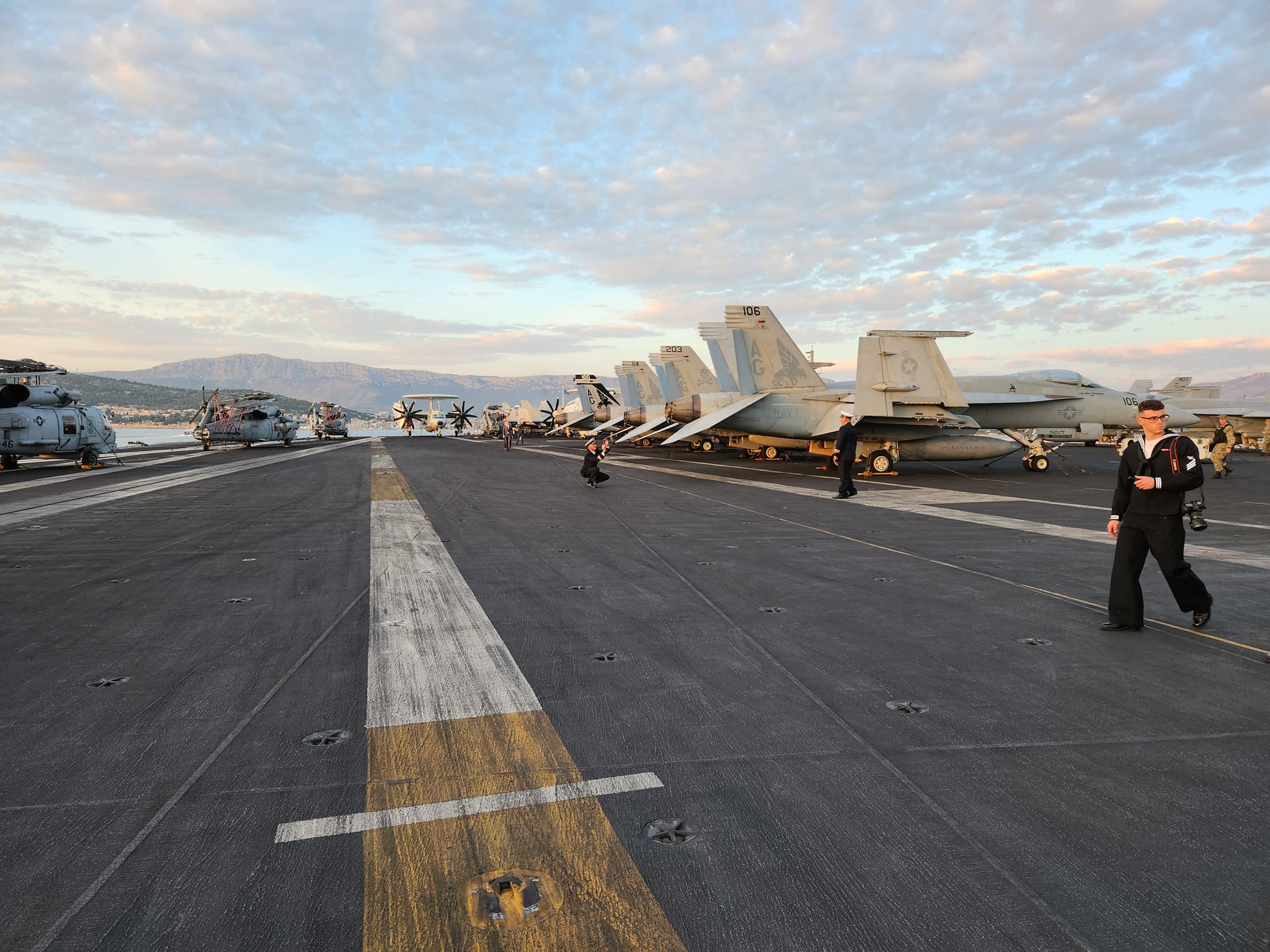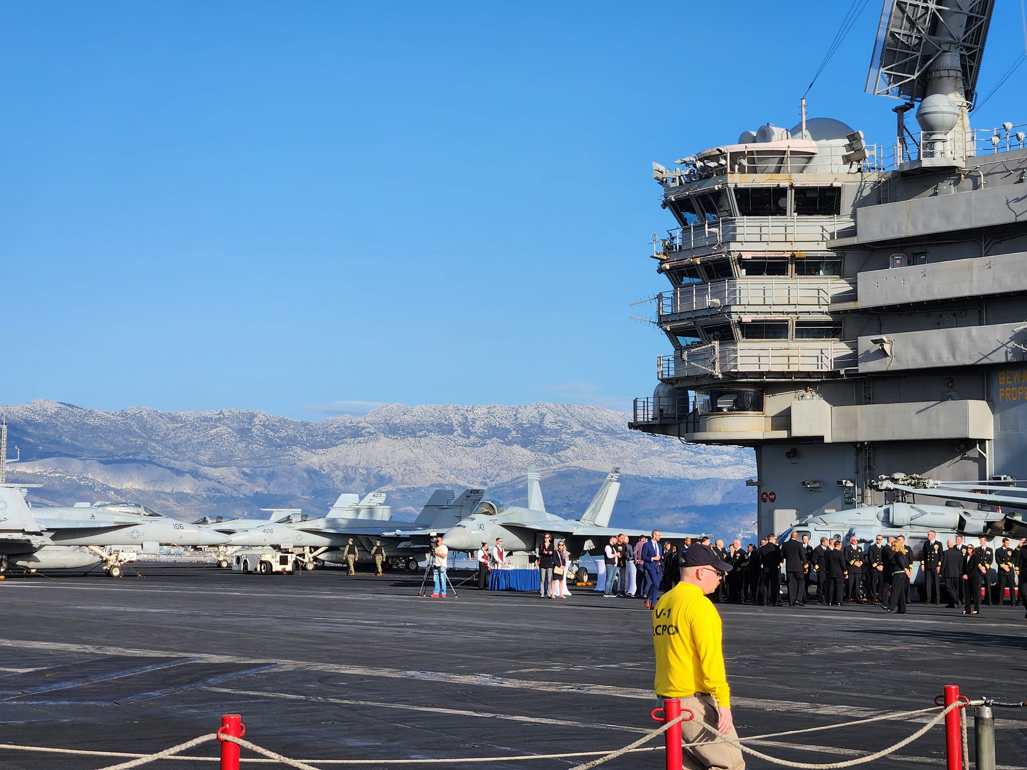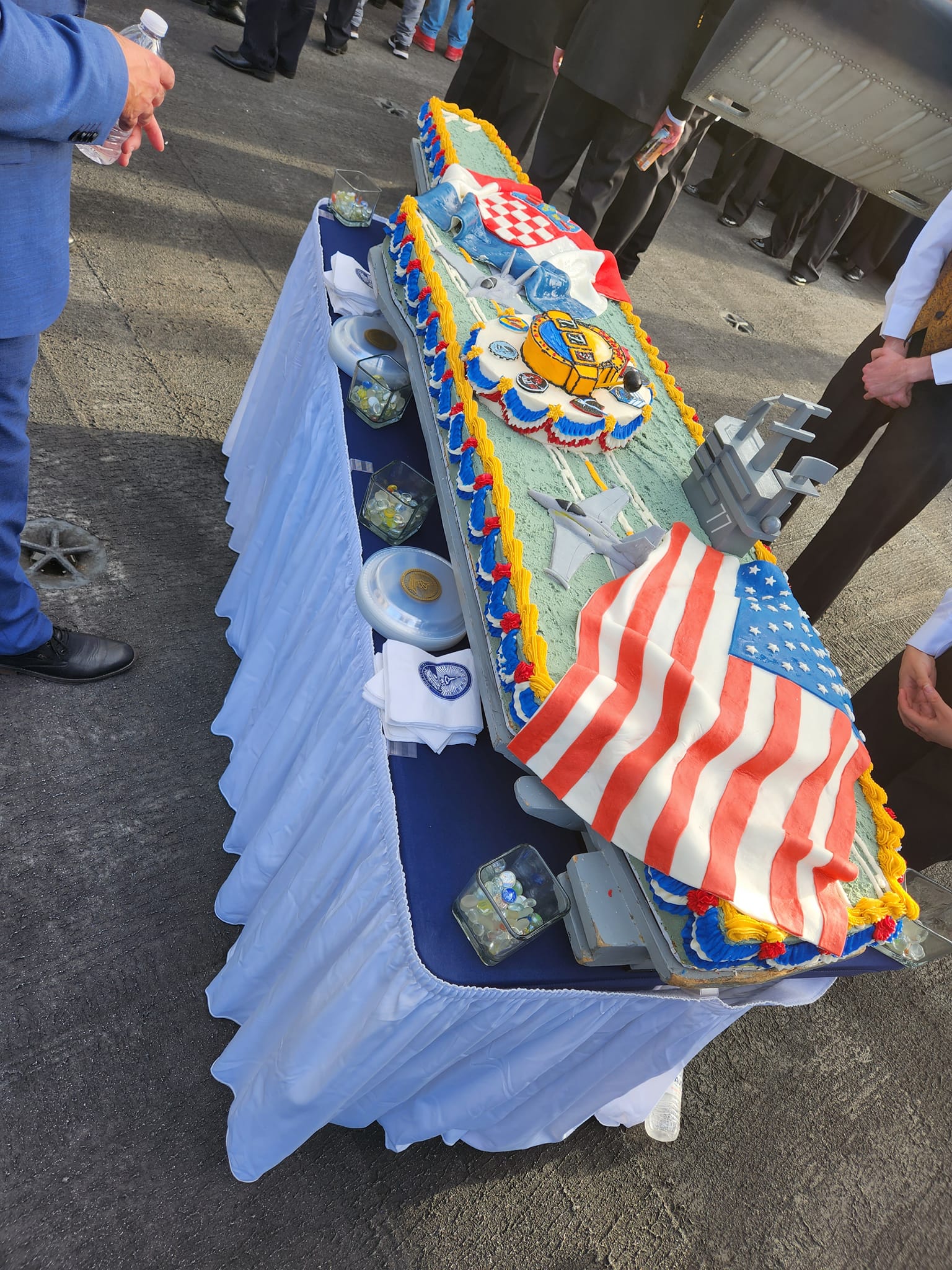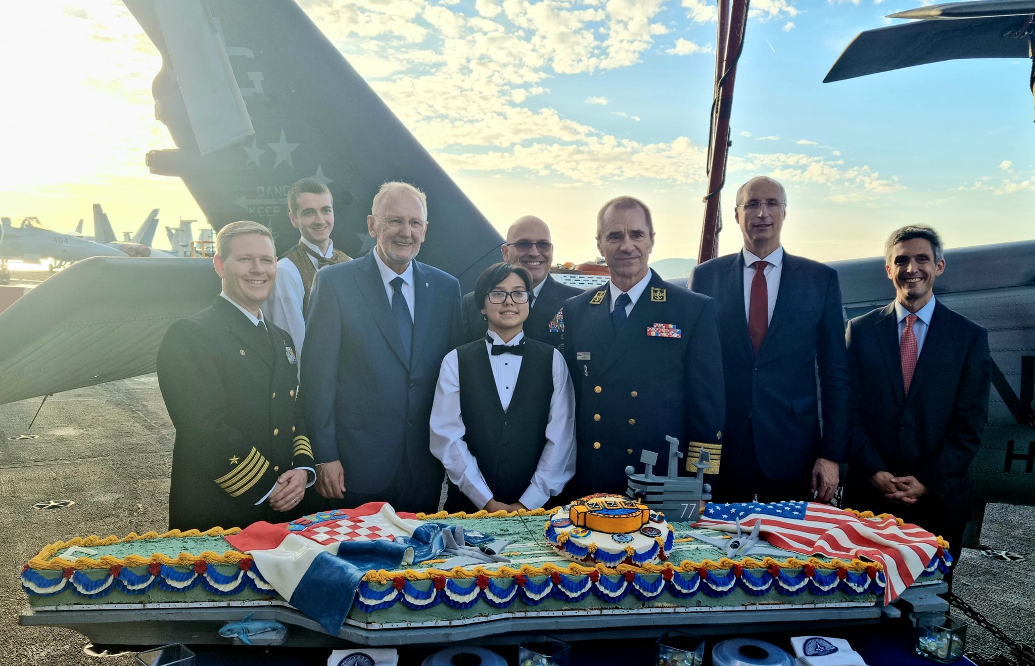 Uz njih je u posjet nosaču stigao i načelnik Glavnog stožera Oružanih snaga Republike Hrvatske admiral Robert Hranj, te splitski gradonačelnik Ivica Puljak, a domaćini su ih dočekali s tortom u obliku nosača, prekrivenog hrvatskom i američkom zastavom.