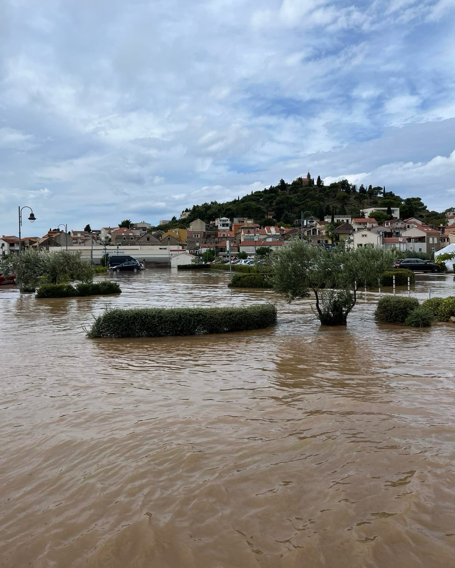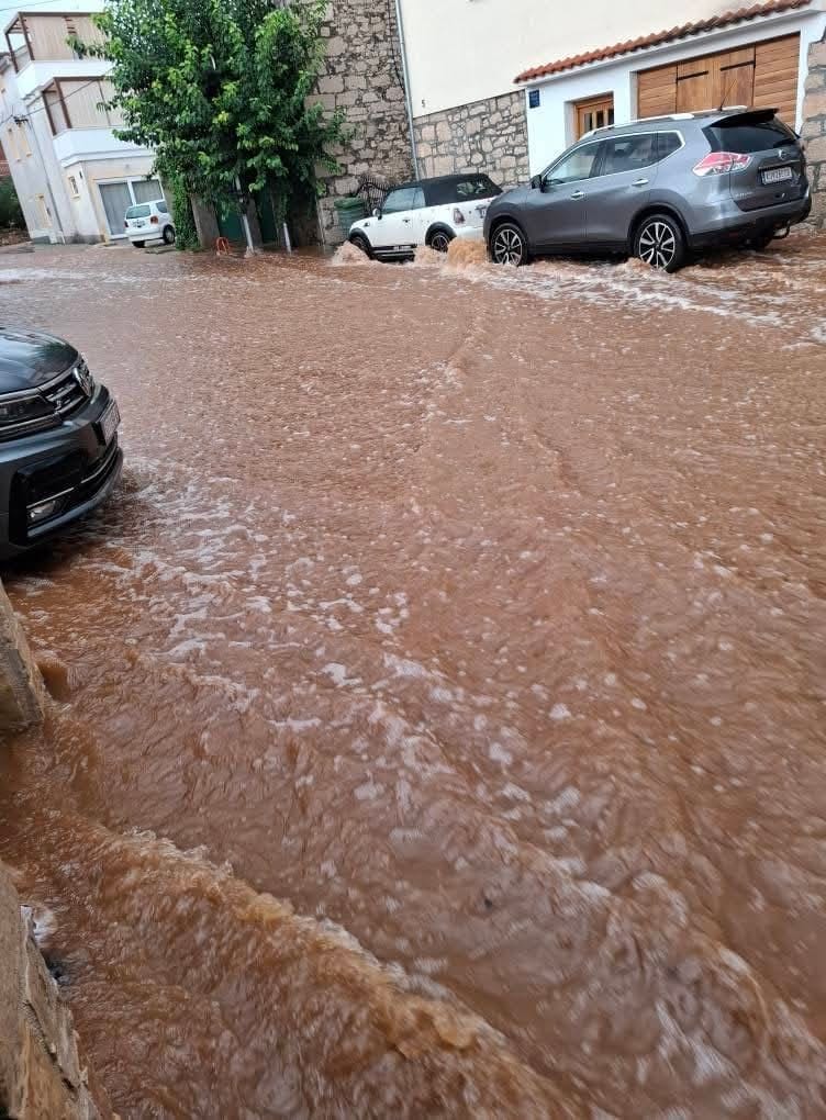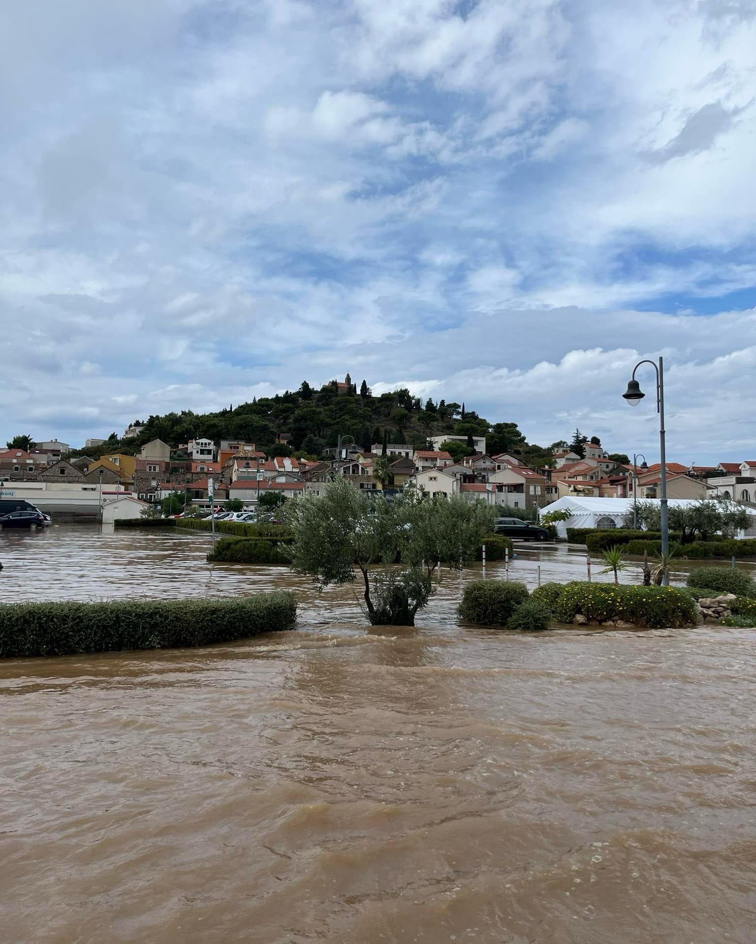 Vode zaista ima "kao u priči", bujične poplave otežavaju život na šibenskom području, vatrogasci imaju pune ruke posla, a građanima se savjetuje da odgode putovanja i ostanu na sigurnom. Ovako izgleda Tribunj nakon obilne kiše koja se danas na njega srušila.