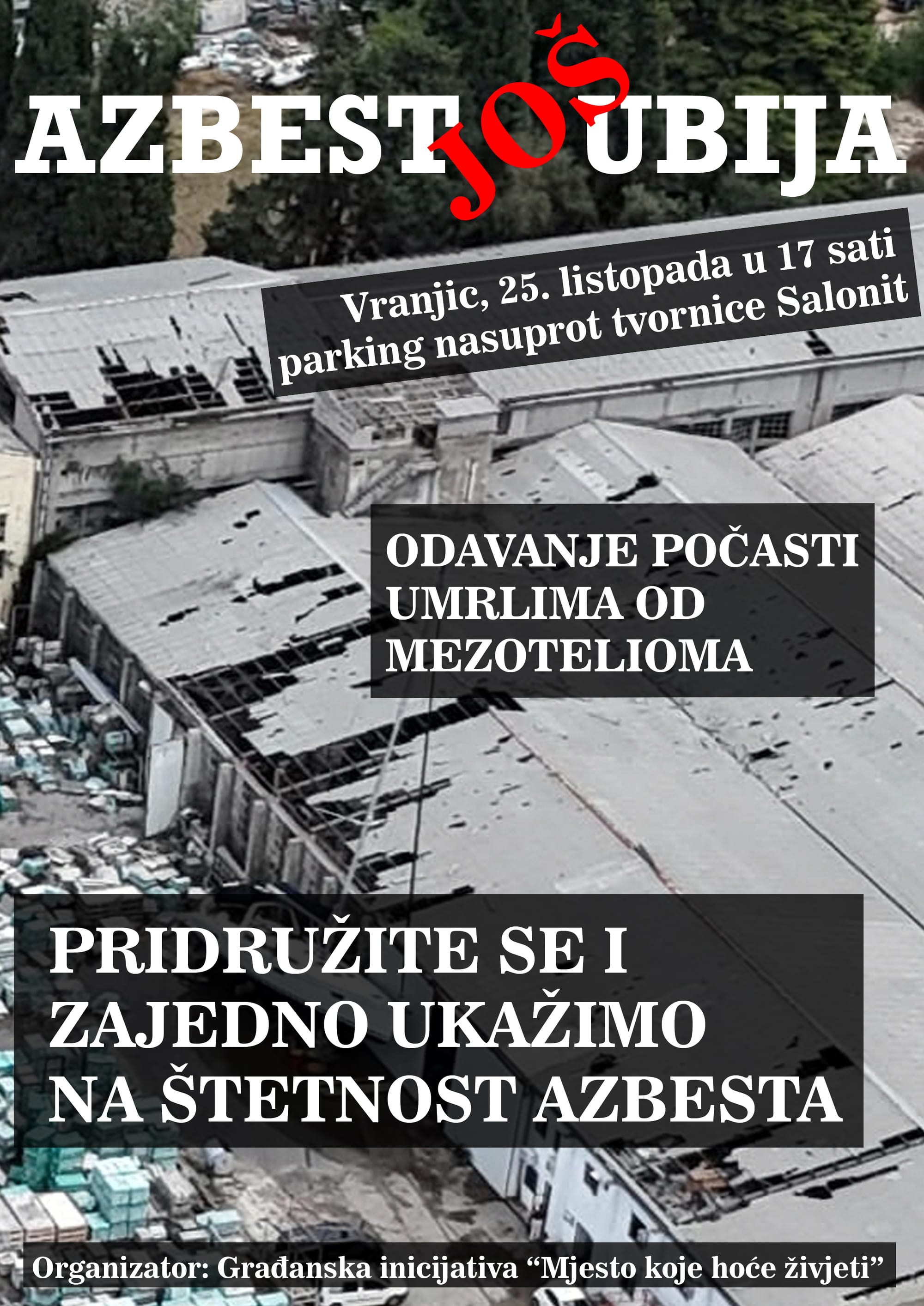 - Ovim mirnim i edukativnim načinom želimo ukazati na štetnost azbesta i njegove bolne posljedice za stanovništvo. Cilj nam je podignuti svijest o njegovoj opasnosti i još uvijek itekako bliskoj prisutnosti među nama. Ne možemo očekivati svjetliju budućnost samo čekajući. Koliko još generacija mora trpjeti posljedice tvornice Salonit i strahovati kad osjete zaduhu te ukapati svoje najmilije zbog nemara? Tvornica Salonit i dalje predstavlja opasnost, iako se službeno vodi kao sanirana, u njoj je i dalje sve puno azbesta. Azbest je zabranjen 2006. godine, ali u Vranjicu se i danas susrećemo s njim u najgorem (lomljenom) obliku - poručuju iz inicijative.