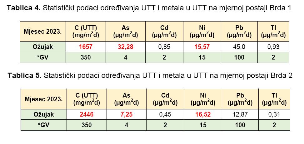 Pri mjerenju ukupne taložne tvari na obje postaje, mjesečne količine ukupne taložne tvari, a unutar nje i arsena i nikla prekoračile su parametre iz Uredbe o razini onečišćujućih tvari u zraku (rezultati na slici).