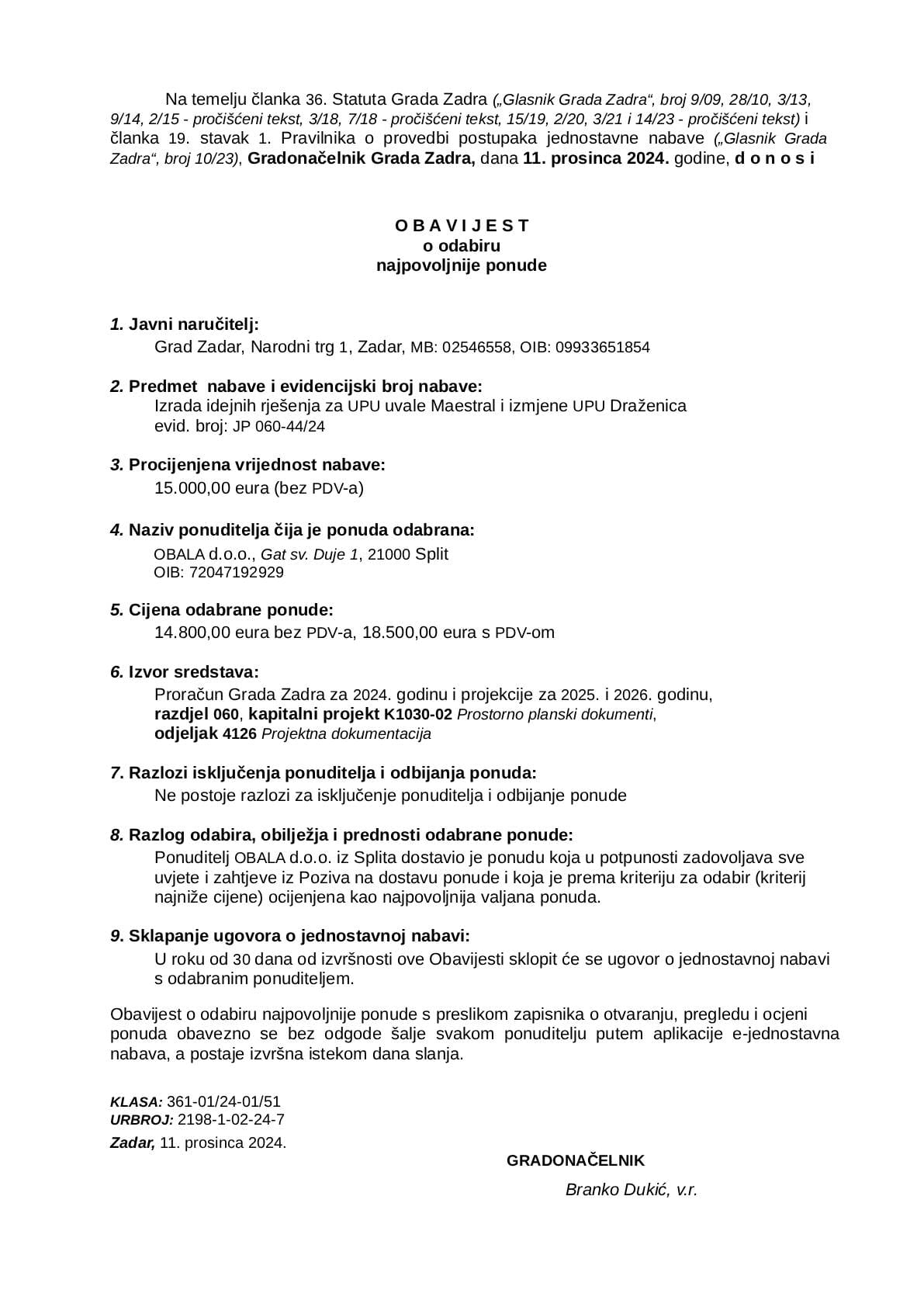 Predmet nabave bila je, kako se navodi u odluci, izrada idejnog projekta s instalacijama za projekt rekonstrukcije i dogradnje luke Maestral. U obuhvatu obalnog pojasa Grada Zadra, od uvale Dražanice do plaže Jadran („Marex“), sveukupno razvijene dužine od cca 650m, potrebno je izraditi idejni projekt luke otvorene za javni promet Maestral, odnosno idejni građevinski projekt (tehnički opis, nacrti), idejni projekt vodoopskrbe te elektroinstalacija.