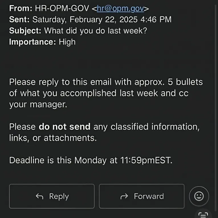 "Molimo, odgovorite na ovaj e-mail s otprilike pet stvari koje ste postigli prošli tjedan. Molimo vas da ne šaljete nikakve klasificirane podatke, poveznice ili privitke", stoji u mailovima koji su poslani iz ljudskih resursa američkog Ureda za upravljanje kadrovima. Naslov mailova je: "Što ste radili prošli tjedan?"