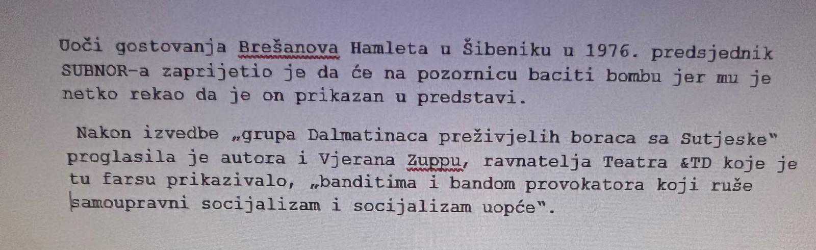 Prije gotovo pola stoljeća, 1976. godine, lokalni predsjednik SUBNOR-a je na vijest da će Teatar &TD nastupiti u Šibeniku s “Predstavom Hamleta u selu Mrduša Donja” Ive Brešana, rekao da će ukoliko se predstava izvede na pozornicu baciti bombu, podsjeća pak na jedan gotovo identičan slučaj Telegram.