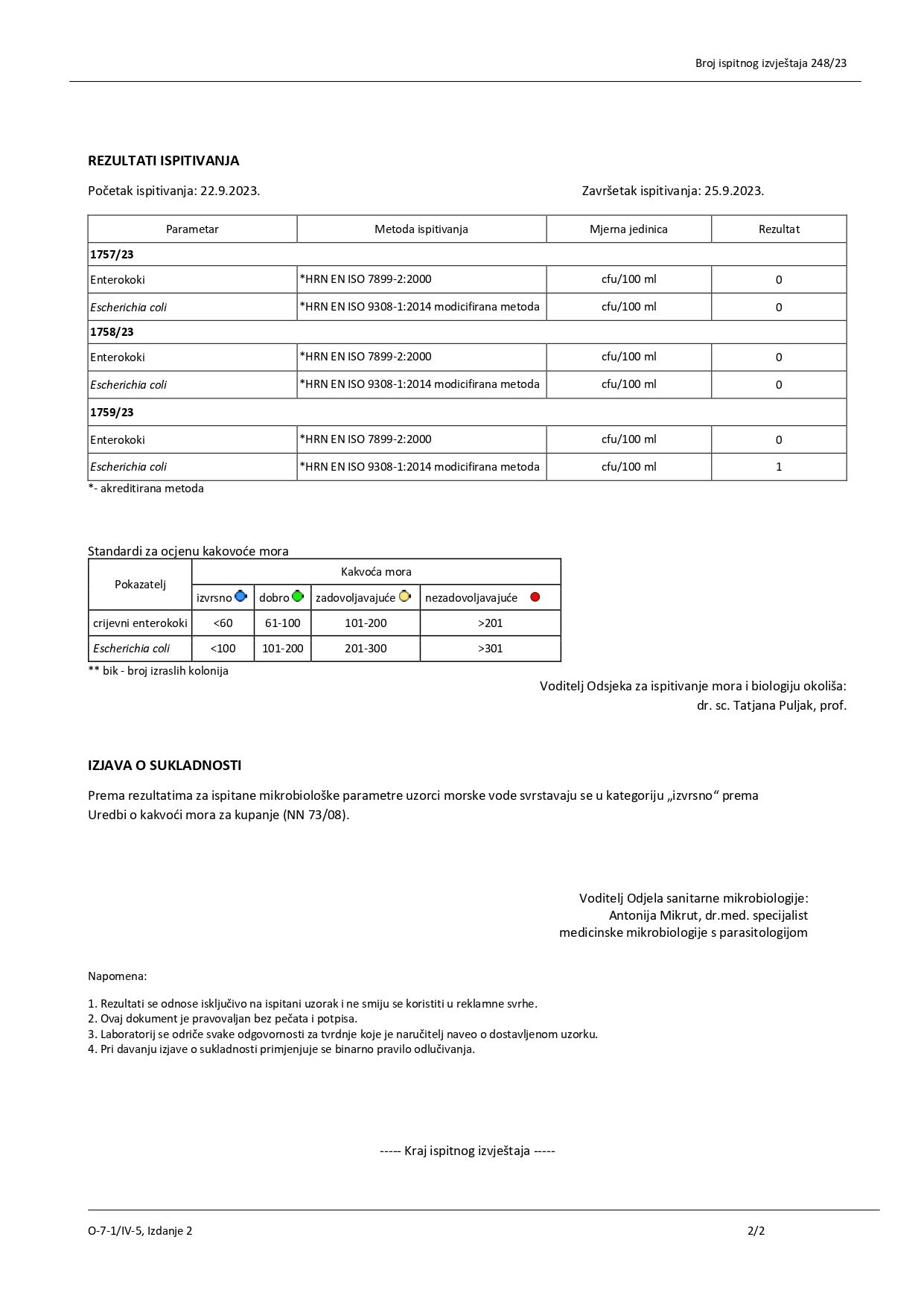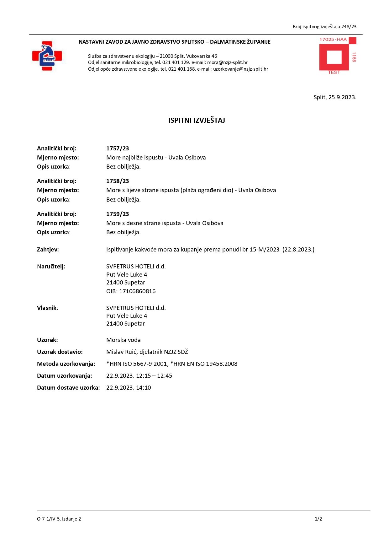 Propust koji se dogodio s tehnološkom vodom smo odmah korigirali, ali u tom slučaju se ne radi o nikakvom ugrožavanju javnog zdravlja niti o fekalnim vodama kako su pojedinci pokušali imputirati", pojasnili su i poslali izvještaj kojeg potpisuje Nastavni zavod za javno zdravstvo Splitsko-dalmatinske županije, a datum uzorkovanja bio je 22. rujna 2023. godine, dakle dan nakon što smo objavili članak koji je alarmirao javnost.