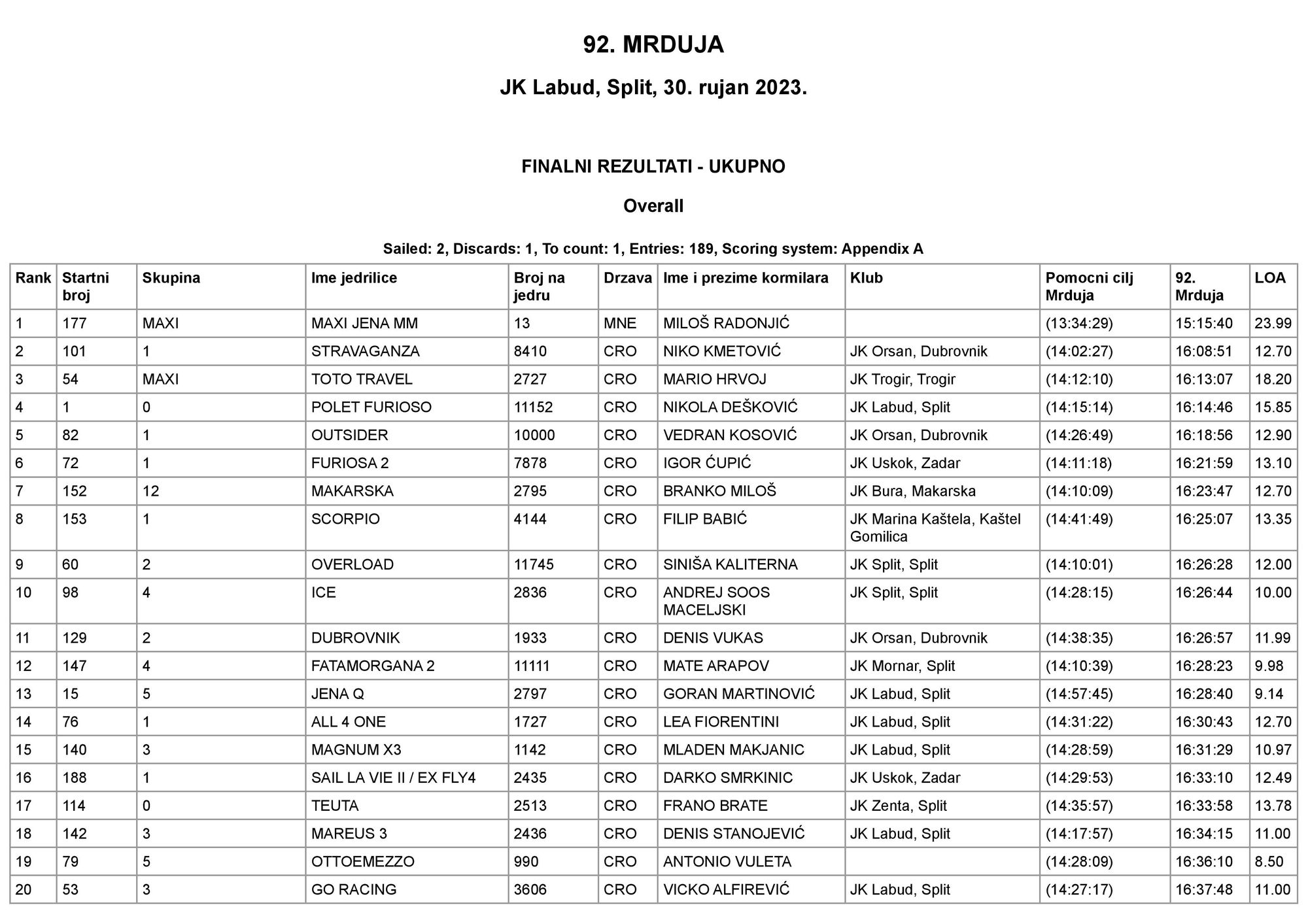 Crnogorsko, hrvatsko, slovenska posada na crnogorskom maxi krstašu Maxi Jena MM, skipera Miloša Radonjića prva je, među flotom od 198 jedrilica i preko 1500 jedriličara uplovila u cilj i primila prelazni pokal Mrduje od direktora Mrdujske regate Damir Skelina. Ujedno prvi su po slabom vjetru, bolje reći bezvjetrici, došli do Mrduje nakon dva sata, 34 minute i 29 sekundi jedrenja, a u ciljnu liniju su prošli nakon 4 sata i 15 minuta te 40 sekundi regatavanja.