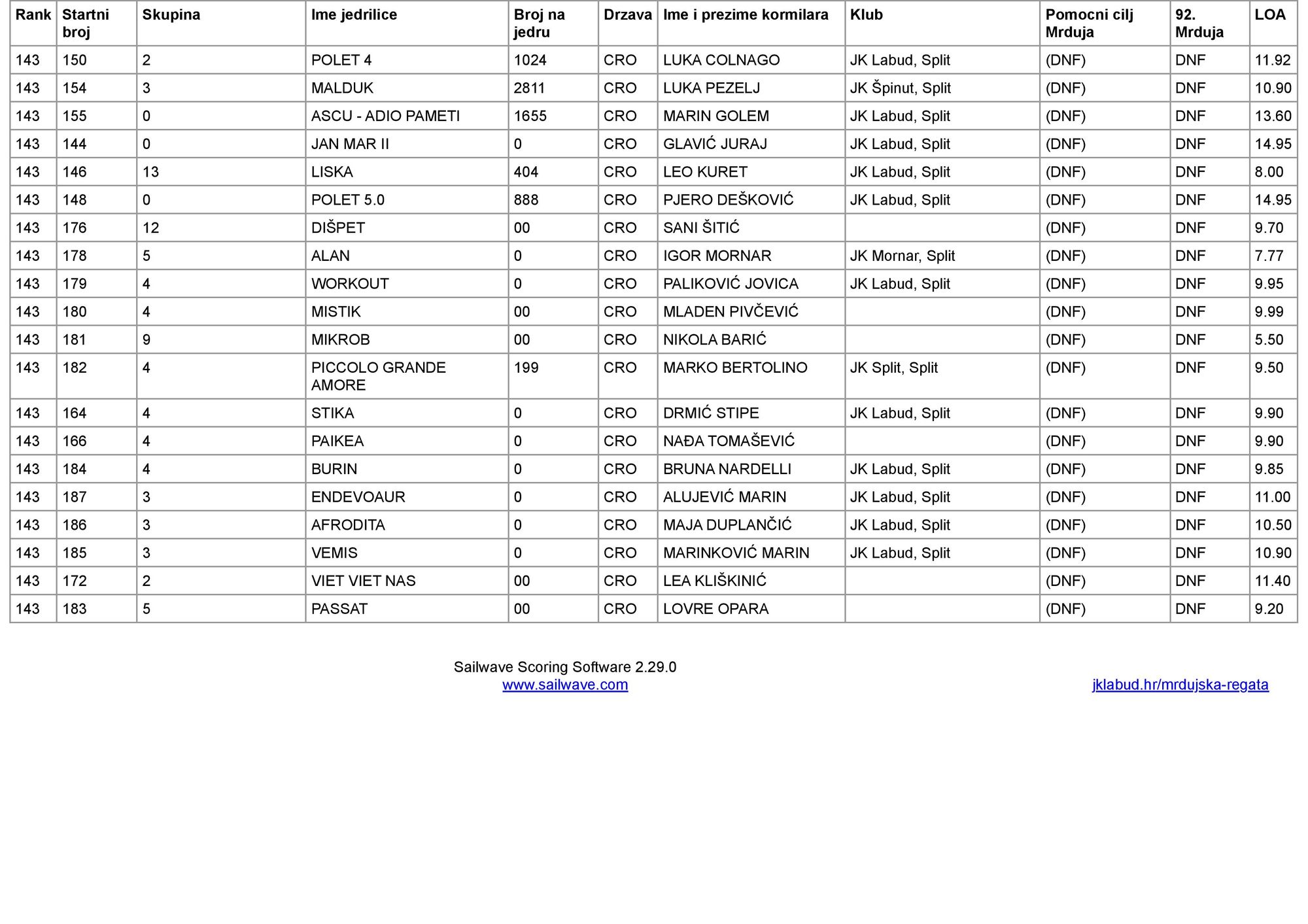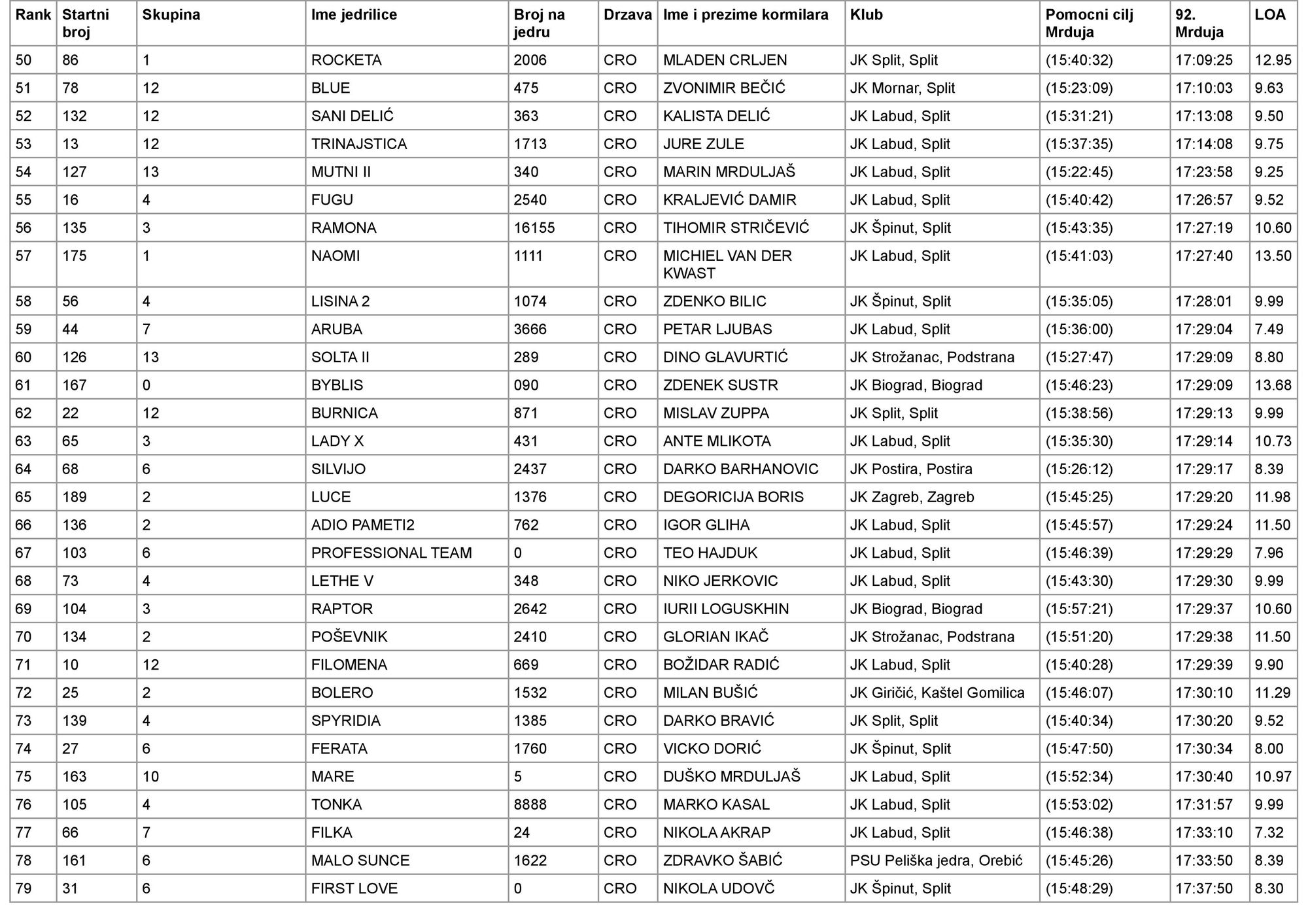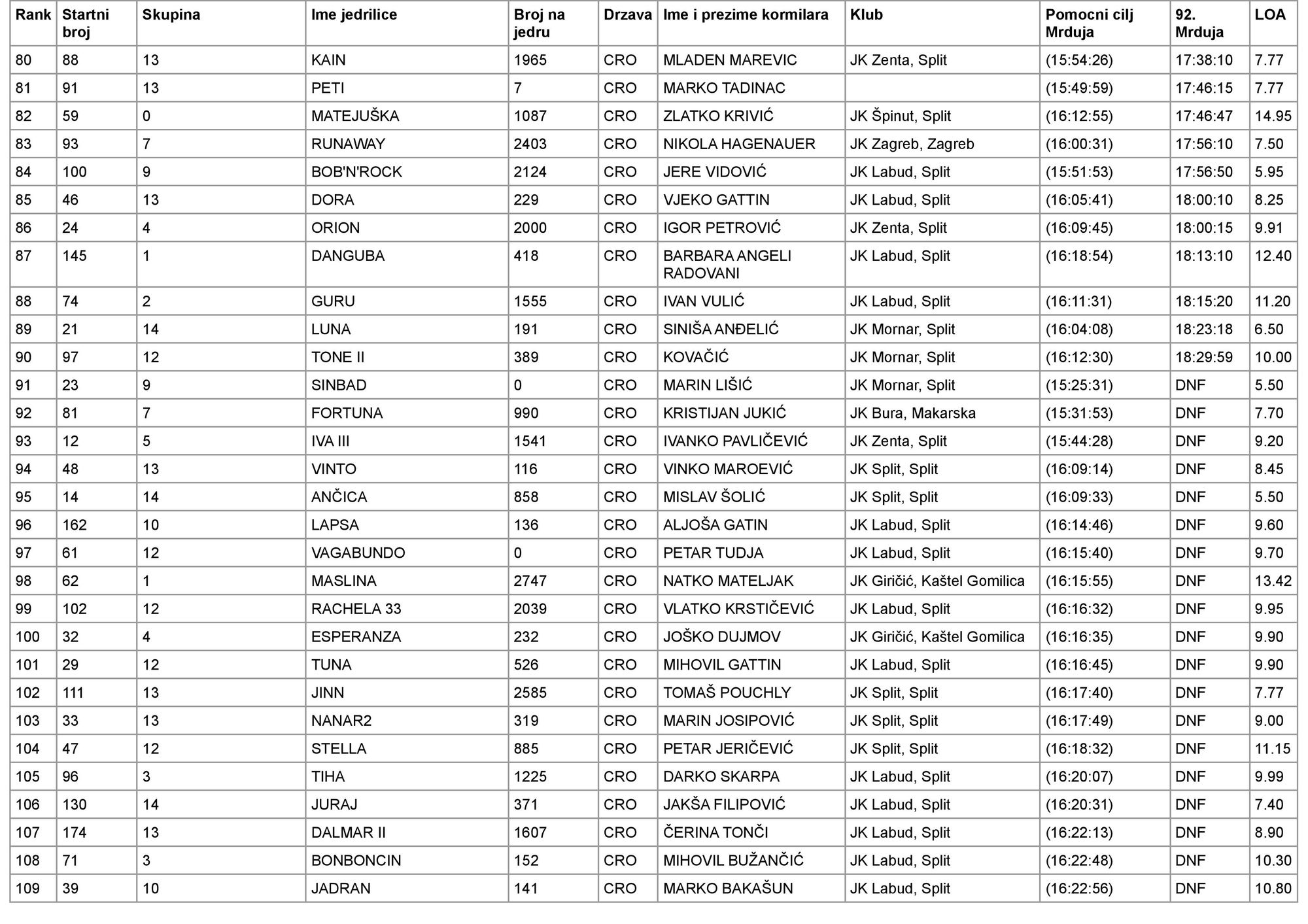 Dok je peta jedrilica "Outsider" kormilara Vedrana Kosovića iz dubrovačkog Orsana sa vremenom od 5:18,56 jedrenja. Šestu poziciju u prolazu kroz cilj uknjižio je brod "Furiosa 2" Igora Ćupića iz zadarskog kluba Uskok sa 5:21,59 sati jedrenja. Posada Maxi Jene MM tako je nakon 3 uzastopne pobjede krenula putem mogućeg osvajanja još jednog rekorda, a to je 5 uzastopnih pobjeda na Mrduji koje drži legendarni „Labudaš“, još uvijek u jedrenju aktivni Branko Širola. Raduje sudjelovanje mnoštva mladih jedriličara nove generacije, porast broja manjih jedrilica na regati, te posada iz svih klubova na potezu od Zadra do Dubrovnika, ali i stalan porast broja stranih, posebno rekreativnih posada. Usprkos slabom vjetru, a povremeno i bonaci, oko 150 jedrilica je prošlo rezervni cilj na Mrduji, a do 18.30 sati i njih preko 90 onaj pravi cilj podno Sustipan pred Splitom.