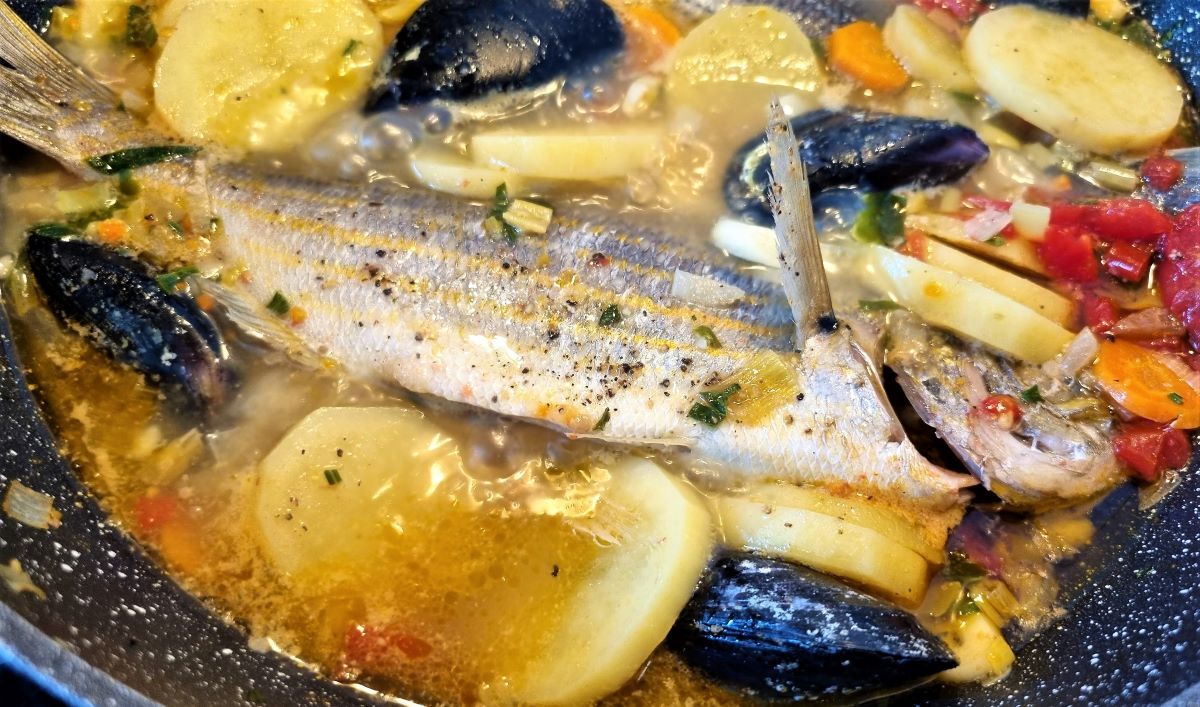 Preporučujem da jelo servira kuhar ili domaćin. Ribu treba nježno vaditi,po mogućnosti u komadu, svaku na svoj duboki tanjur. Preko nje preliti kuhano povrće i rižu s tekućinom (juhom), preko svega nakapati još maslinovog ulja i posuti s malo sjeckanog peršina. I to bi bilo to!