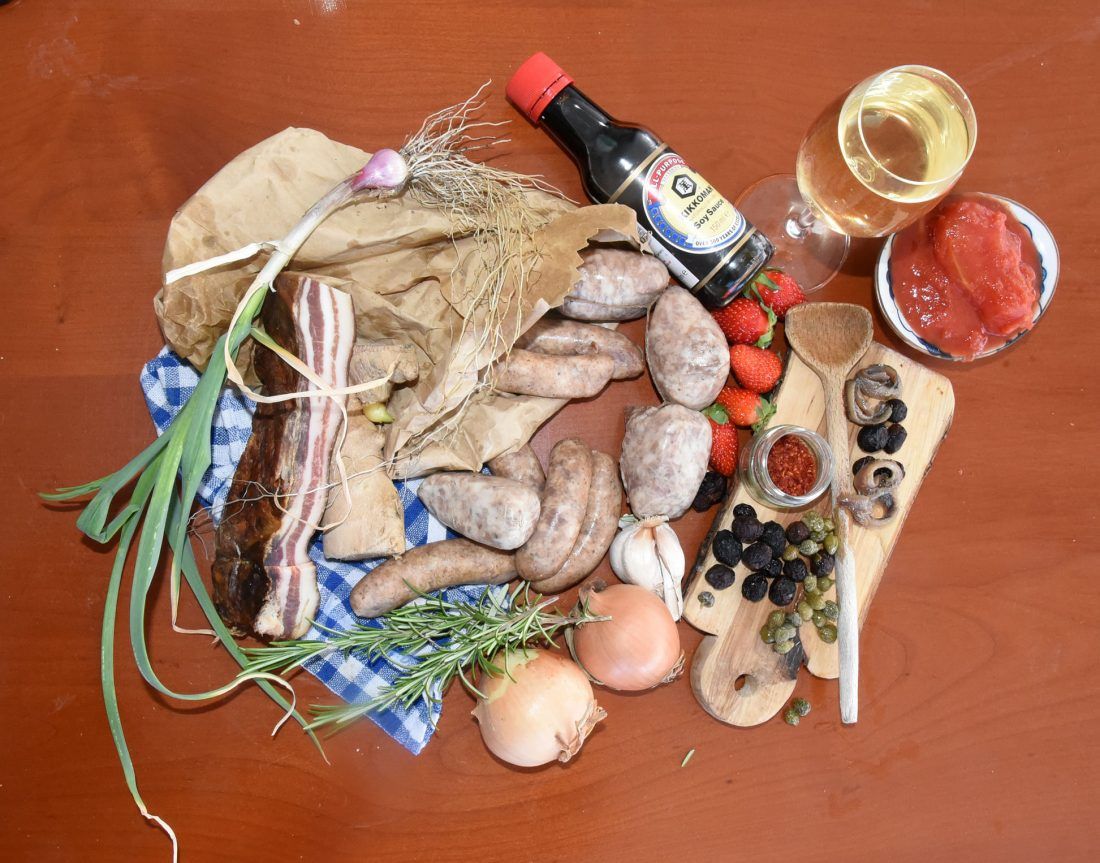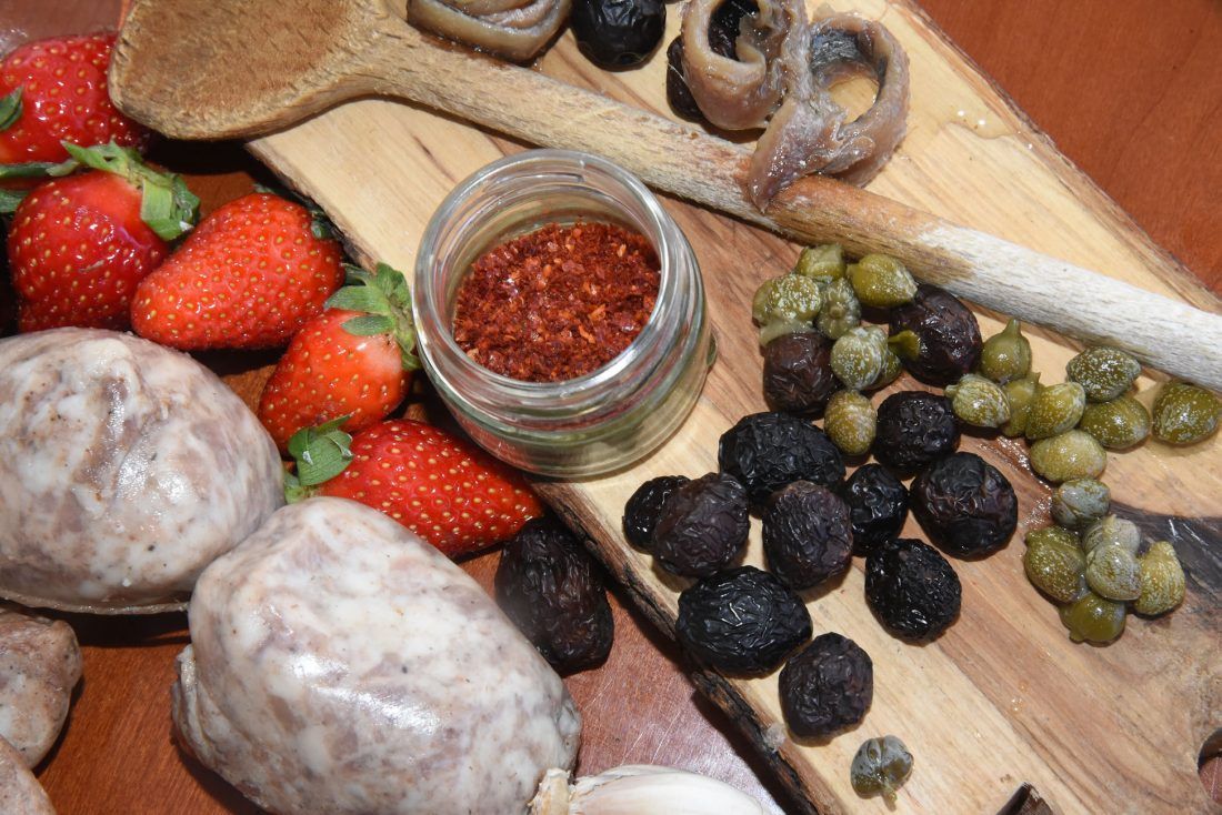 Nadoda lipo prošaranu pancetu od Maleša narizanu na male ploškice; onda sam zažutija kapulu i malo posolija krupnom ninskom solju; nadoda po važa pelata, pola malog kućarina mojih mlivenih papričica od „penis chilya“; masline domaće lanjske iz leda otkoštija i ubacija; 2 slana inćuna; 2 kućarina kapara; malo đumbira; biloga papra prstohvat; kućarin soje. Dva deca Graševine.