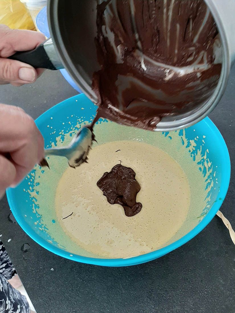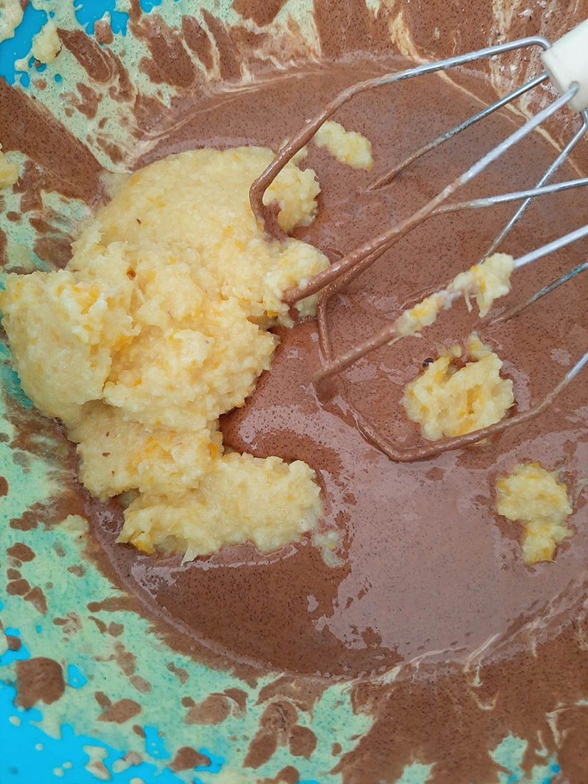 Sljedeći idu mliveni orasi – miksajte lagano; nježno dodajte užbačena bilanjca i još nježnije mišajte ručno da se dobro sljubi,