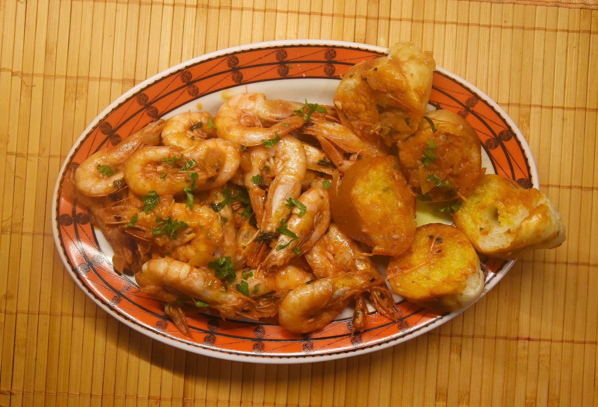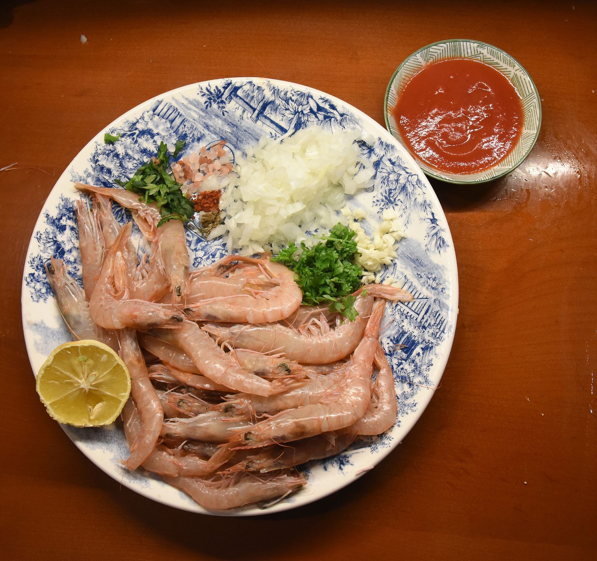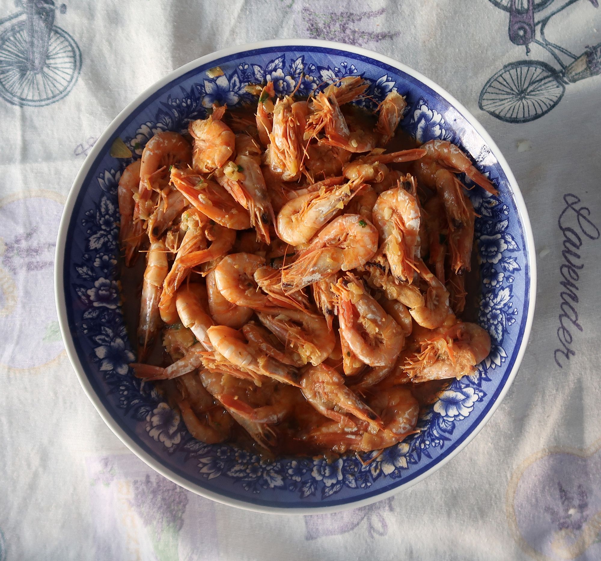 Odma uvečer par većih kozica na toč. Uje lipo Dobrodolačko, kapula jedna mala, luka dva češlja, petrusimena i selena, šuga od pomidora, čašu biloga vina, himalajsku sol, tursku čili papričicu (teke), soka od limuna, i turski crni papar koji je skroz drugog okusa i mirisa nego naš. To lipo za večericu i utočali u šug jednu bubicu od jučer. Šest jezika je govorila.