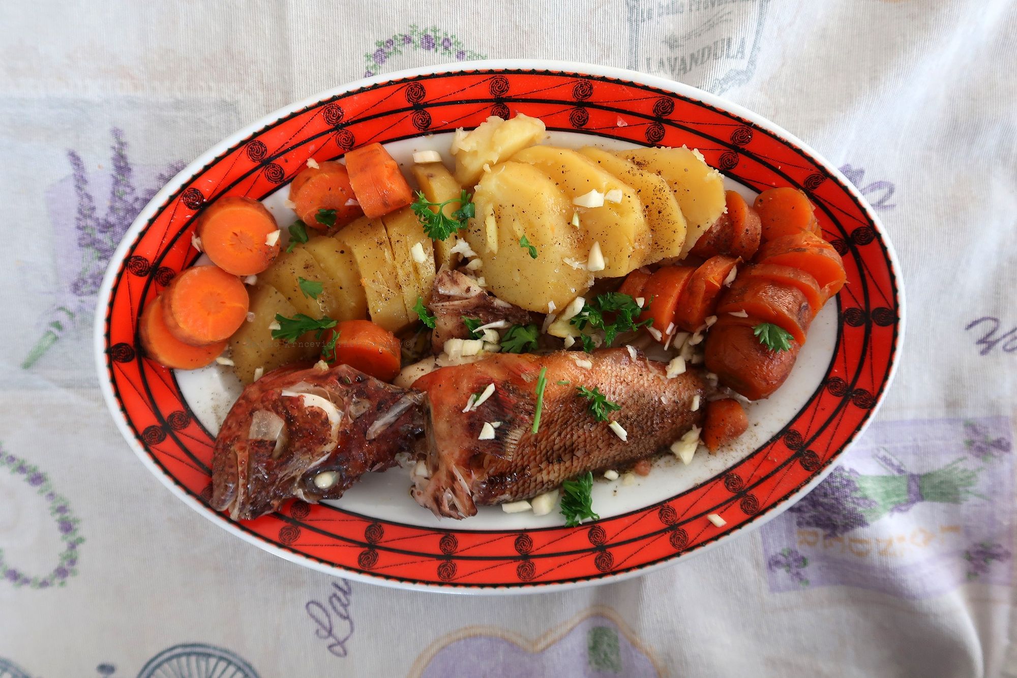 A onda sutradan, tj. jučer, juhica od jedne škrpinice – s kumpirima lešim, pa frigani moli (lipši od ičega), kozice na buzaricu bez prezle (na slici je šug osta na dnu zdile).
