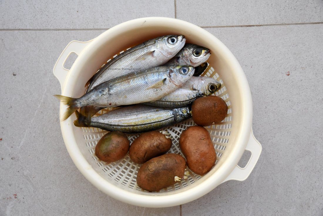 E, vratimo se ovom našem ručku za 30 kunića. Dakle, bugve kupljene u jednog mog dragog prijatelja a kumpir iz OPG-a. Kapula crvena kupovna. Triba je ne rizat, nego diljati tako da je držite u livoj ruci, a nožom lagano stružete po njoj i skidate tanke, tanke fetice. Tako da osjetite okus i miris bez velikih gelera. Onda su bugve išle na gril tavu jer u stanu nemamo gradele. Kumpir salata s krupnom soli, uljem Dobrodolačkim i kvasinom sa Danila. Ma izvrsno, čak i bez kruva.