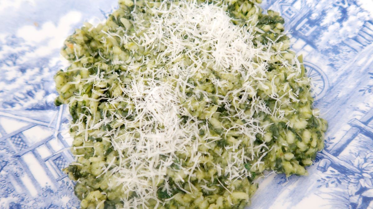 Dodamo špinjaču, pustimo da malo "uvene", dodamo rižu, pa malo tako promiješamo.
