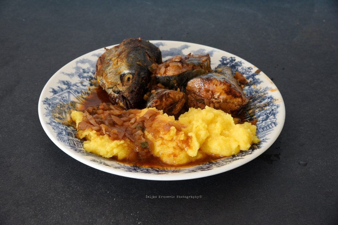 Išao sam na onaj način da malo zažutim kapulu pa dodam ribu izrezanu na komade, pa povrće i malo vina i slatkog aceta balsamica. Malo, samo "dz". Naravno, sve na maslinovom ulju. Od povrća luka, na kraju petrusimena (=peršina), bilog luka (=češnjaka) i šuga od pomidora (=umaka od rajčica). Uz to sam skuhao malo purice (=palente). Okus iskonski ali reduciran. Nadam se skoro i domaćoj puri.