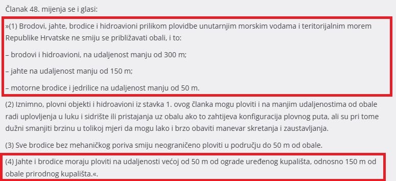 Jahte i brodice moraju ploviti na udaljenosti većoj od 50 m od ograde uređenog kupališta, odnosno 150 m od obale prirodnog kupališta.