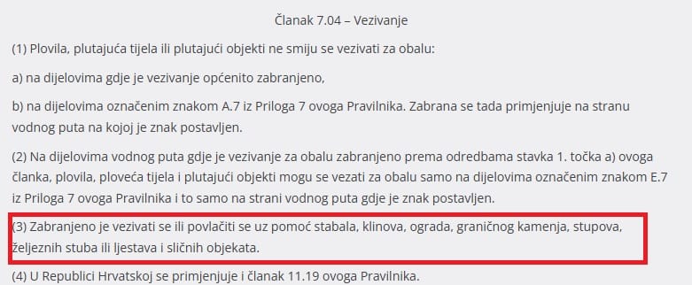 Naime, Pravilnik o plovidbi unutarnjim vodama u članku 7.04, stavku 3 jasno nalaže da je "Zabranjeno vezivati se ili povlačiti se uz pomoć stabala, klinova, ograda, graničnog kamenja, stupova, željeznih stuba ili ljestava i sličnih objekata"